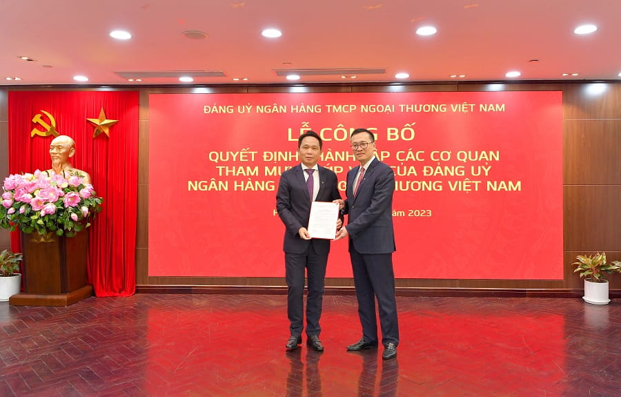 - Tại các Quyết định số 1968, 1969, 1966, 1965- QĐ/ĐU ngày 09/03/2023, Đảng ủy Vietcombank đã ban hành các quyết định Thành lập: Ban Tổ chức Đảng ủy Vietcombank; Cơ quan Ủy ban Kiểm tra Đảng ủy Vietcombank; Ban Tuyên giáo Đảng ủy Vietcombank, và Văn phòng Đảng ủy Vietcombank đặt dưới sự lãnh đạo của Ban Chấp hành Đảng bộ mà trực tiếp là Ban Thường vụ Đảng ủy Vietcombank;