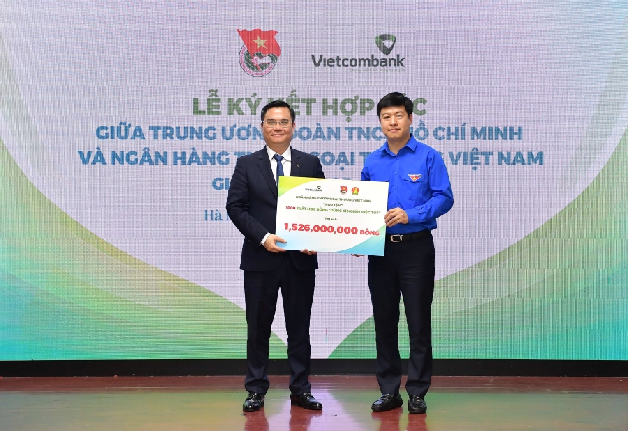 Đ/c Nguyễn Thanh Tùng - Phó Bí thư Đảng ủy, Thành viên HĐQT, Tổng giám đốc Vietcombank (bên trái) trao tặng 1.000 suất học bổng “Dũng sỹ nghìn việc tốt” cho đại diện Trung ương Đoàn TNCS Hồ Chí Minh