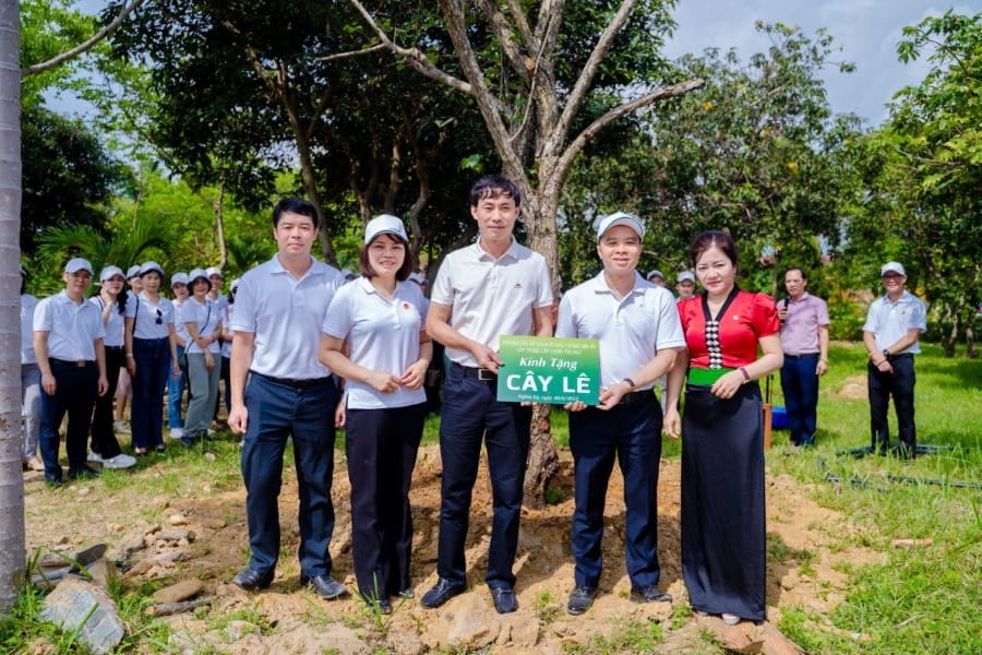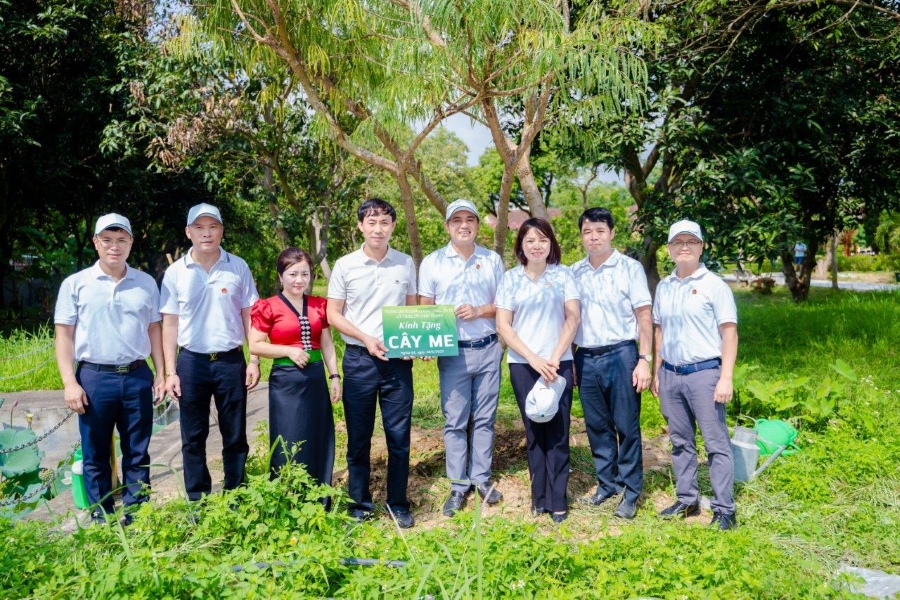 Đồng chí đồng chí Đỗ Việt Hùng - Phó Bí thư thường trực Đảng uỷ, Thành viện Hội đồng quản trị Vietcombank cùng đại diện thầy cô giáo và học viên Lớp TC LLCT K162 tặng cây lưu niệm cho Khu tưởng niệm Chủ tịch Hồ Chí Minh tại thị xã Nghĩa Lộ, tỉnh Yên Bái