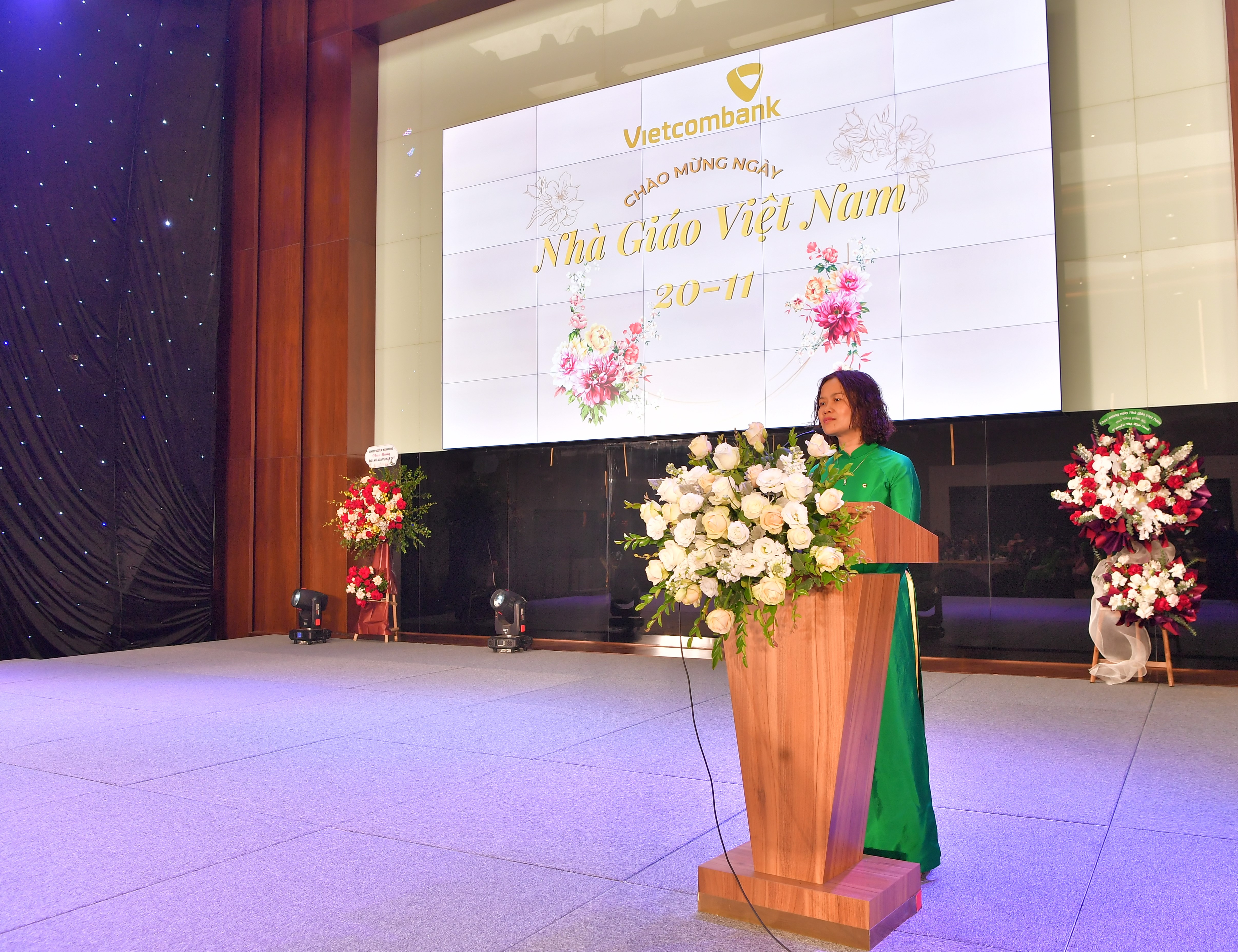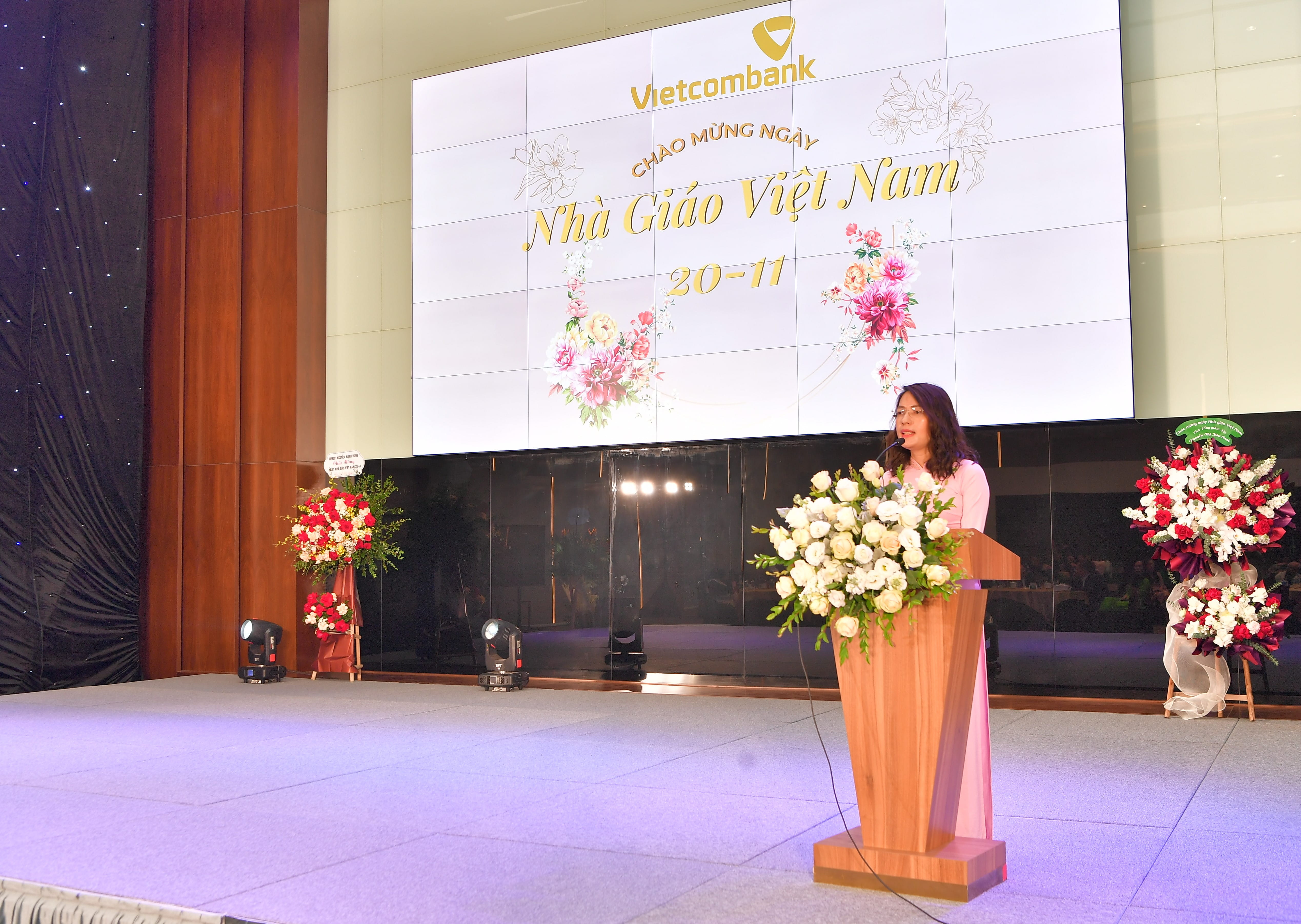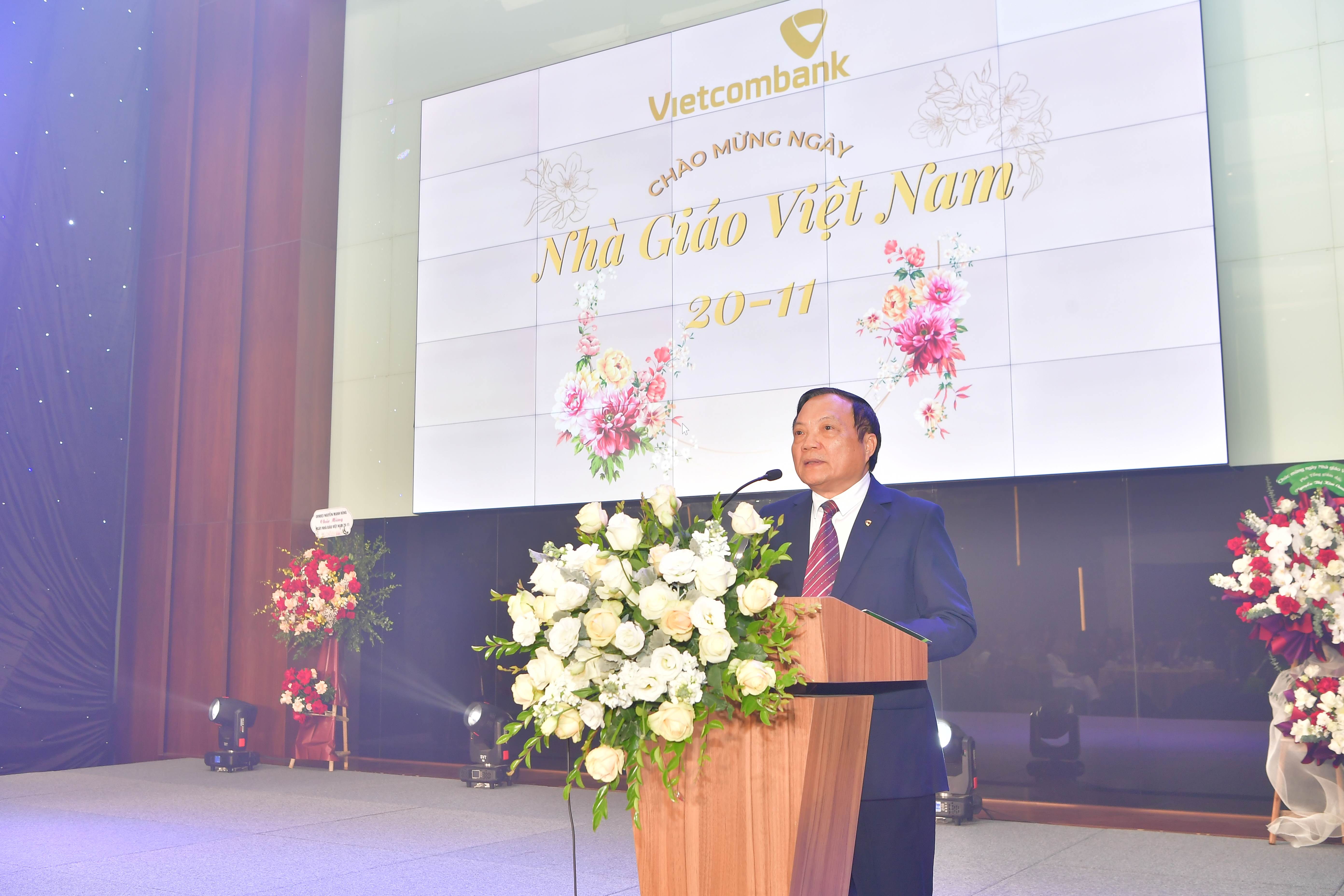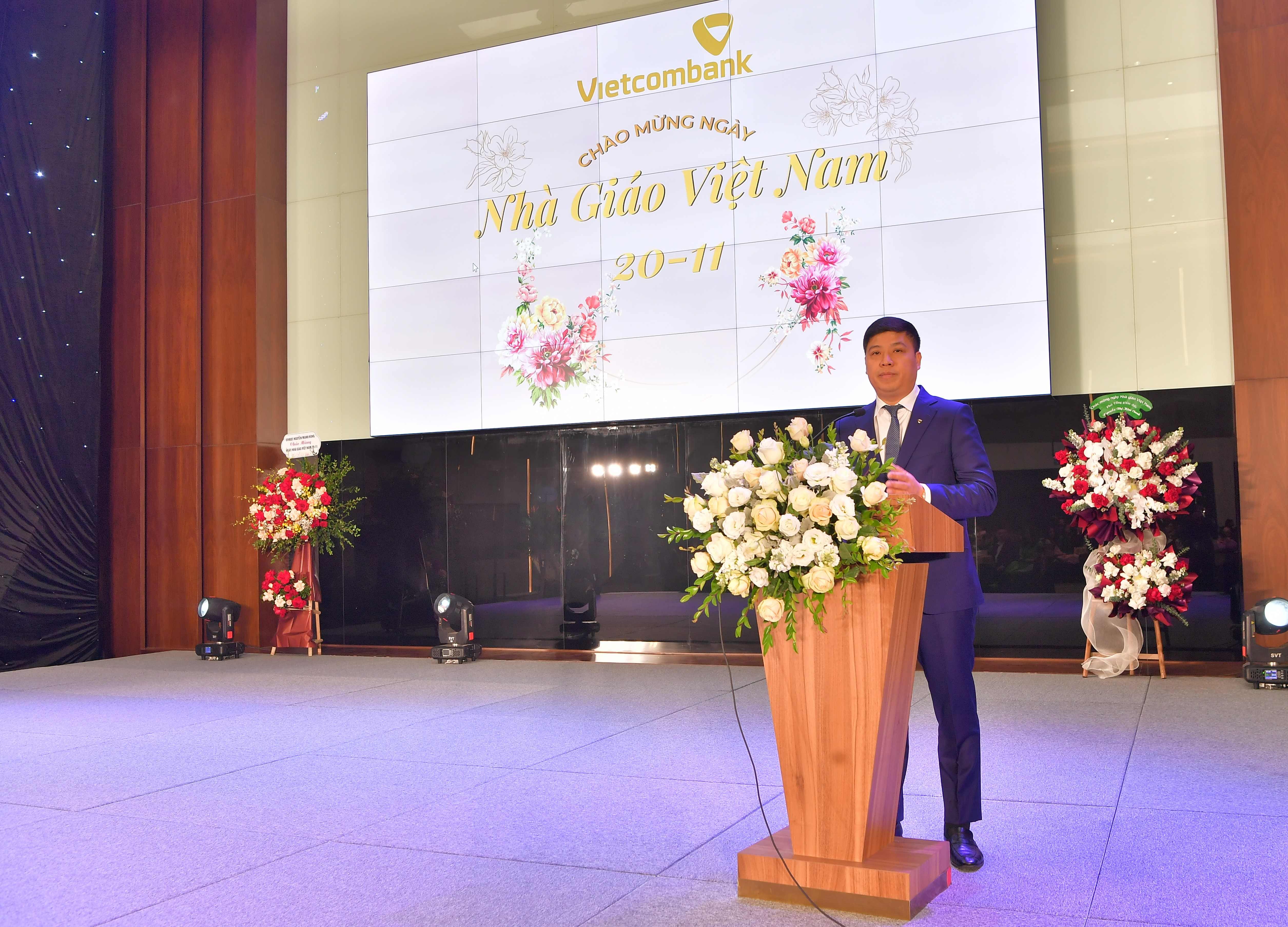 Tại buổi lễ, thay mặt Ban lãnh đạo Vietcombank, ông Hồng Quang - Thành viên HĐQT kiêm Giám đốc Khối Nhân sự đã gửi lời chúc mừng, biểu dương và tri ân tới các cán bộ Trường Đào tạo, các GVNB, những người đang thực hiện sứ mệnh “trồng người”, vì “lợi ích trăm năm” của Vietcombank với những cống hiến âm thầm, lặng lẽ để tạo ra những giá trị vô cùng to lớn và bền vững cho Vietcombank. Ông cho biết: Tôn sư trọng đạo là truyền thống nhân văn tốt đẹp từ ngàn đời nay của dân tộc ta. Truyền thống ấy thể hiện rõ nét nhất trong ngày 20/11 hàng năm là ngày Hiến chương các nhà giáo. Đây là dịp để chúng ta bày tỏ lòng tôn kính, sự biết ơn đến những người thầy giáo, cô giáo, “những kỹ sư tâm hồn”, những “người chiến sỹ trên mặt trận văn hóa”. “Con người với tư cách là chủ thể của mọi sự sáng tạo, kiến tạo nên xã hội. Vì vậy, ở mọi thời đại, ở mỗi hình thái và chế độ xã hội, sự phát triển nguồn lực con người đều được đặt ở vị trí trung tâm. Trong thời đại ngày nay, sự phát triển nguồn nhân lực càng cần thiết hơn bao giờ hết. Ban lãnh đạo Vietcombank luôn xác định yếu tố con người là trung tâm của sự phát triển, quyết định mọi sự thành công của ngân hàng. Con người vừa là mục tiêu, vừa là động lực phát triển của ngân hàng. Từ đó, Vietcombank đã xác định đầu tư cho công tác đào tạo và phát triển nguồn nhân lực là đầu tư cho phát triển dài hạn của Vietcombank”, ông Hồng Quang nhấn mạnh.