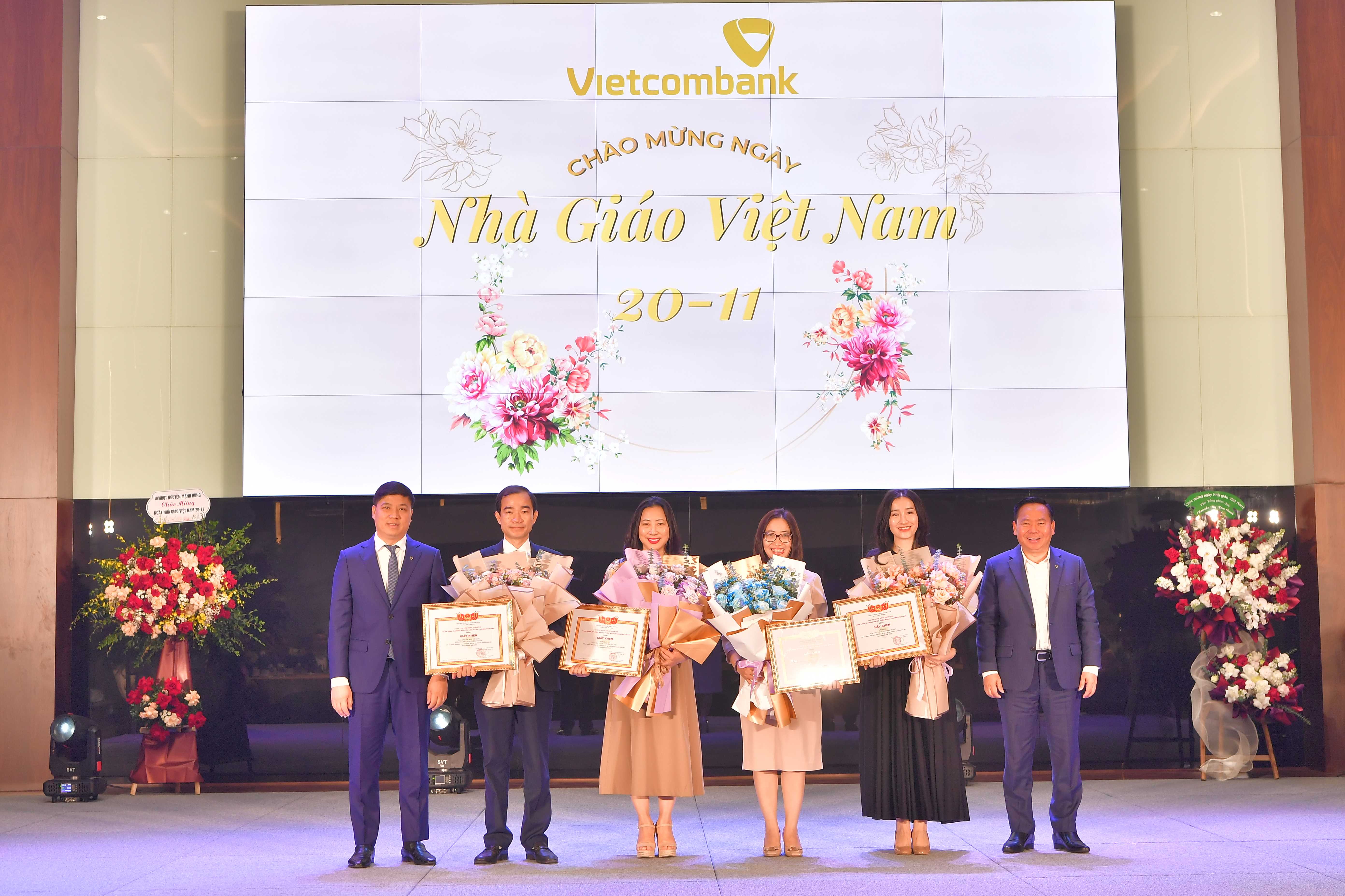Nhân dịp này, Trường Đào tạo Vietcombank cùng 04 phòng/trung tâm tại Trụ sở chính (Văn phòng, phòng Tài chính kế toán, phòng Quản trị và Trung tâm CNTT) và các cá nhân là GVNB tiêu biểu trong công tác đào tạo năm 2023 đã được Ban Lãnh đạo khen thưởng.