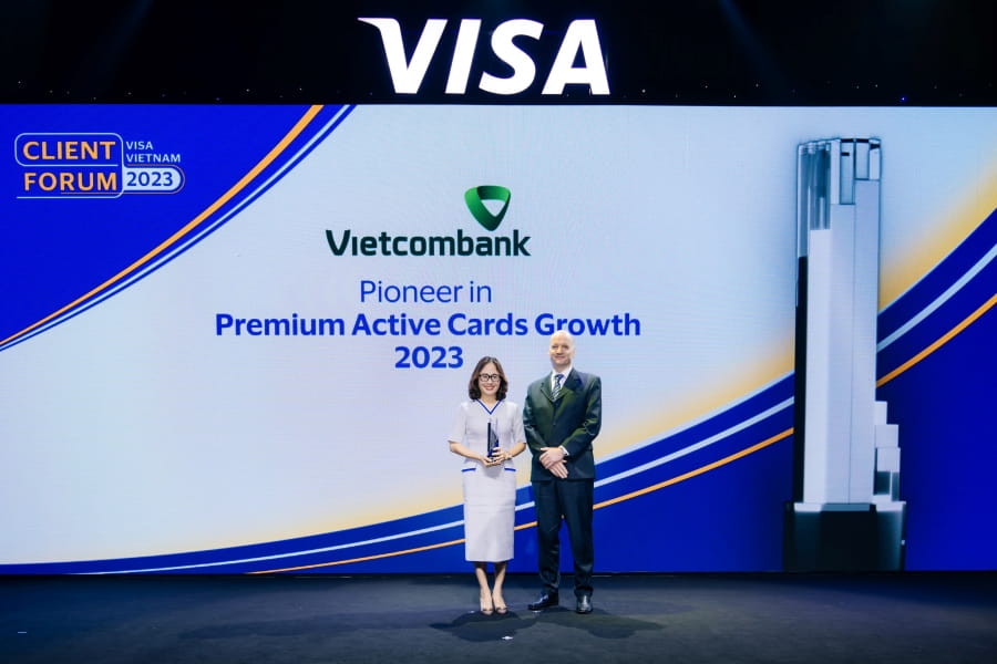 Tại Hội nghị khách hàng của Visa Việt Nam 2023, Vietcombank đã được vinh danh với 02 giải thưởng: “Ngân hàng dẫn đầu về tổng doanh số thẻ doanh nghiệp 2023” và “Ngân hàng tiên phong triển khai hệ thống quản lý chi tiêu dành cho doanh nghiệp lớn 2023”.