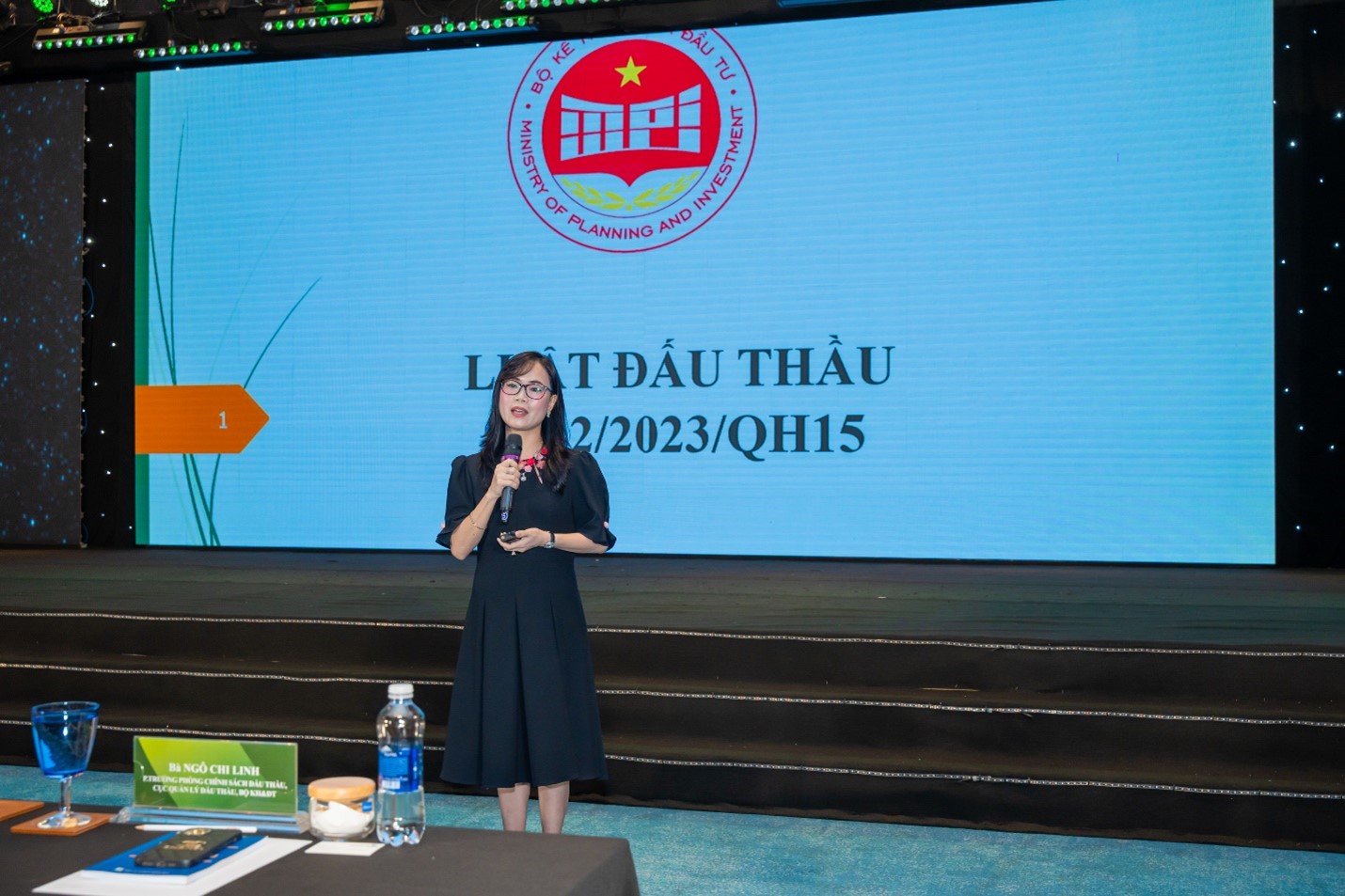 Bà Ngô Chi Linh – Phó Trưởng phòng Chính sách đấu thầu, Cục Quản lý đấu thầu thuộc Bộ Kế hoạch Đầu tư trao đổi nội dung Tập huấn Luật đấu thầu năm 2023 tại Chương trình