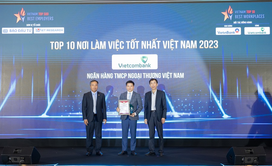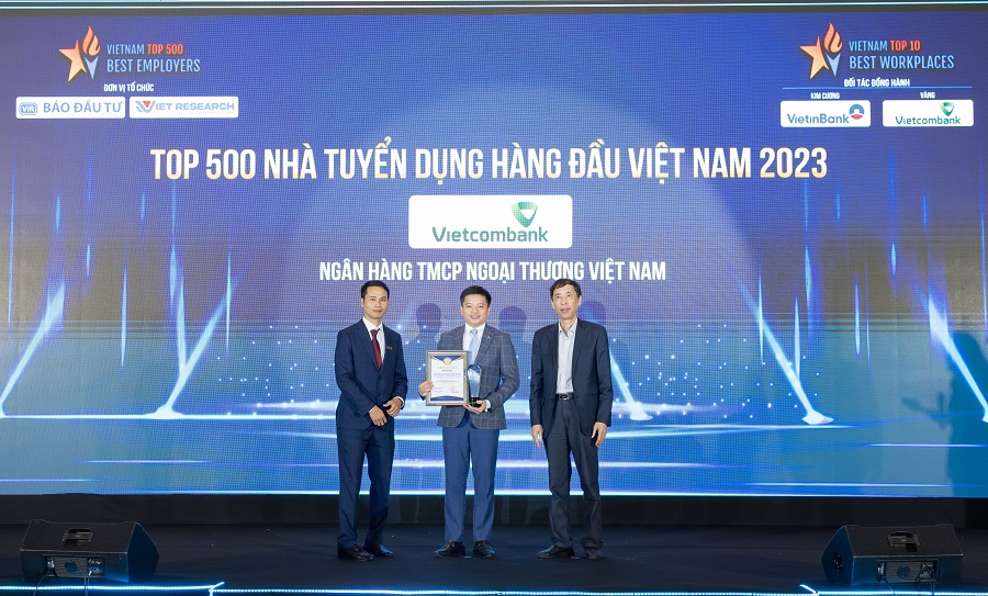 Ngày 8/12/2023 vừa qua, tại khách sạn Pullman, Hà Nội, Báo đầu tư phối hợp cùng Công ty cổ phần Nghiên cứu Kinh doanh Việt Nam (Viet Research) tổ chức Lễ công bố Bảng xếp hạng Top 500 Nhà tuyển dụng hàng đầu Việt Nam (VBE500) và Top 10 Nơi làm việc tốt nhất Việt Nam 2023 trong các ngành kinh tế trọng điểm (VBW10) cùng Hội thảo nhân sự với chủ đề: “Tương lai thị trường lao động và các xu hướng môi trường làm việc mới”. Tại sự kiện, Vietcombank được vinh danh top 10 nơi làm việc tốt nhất Việt Nam 2022 và Top 500 nhà tuyển dụng hàng đầu Việt Nam.