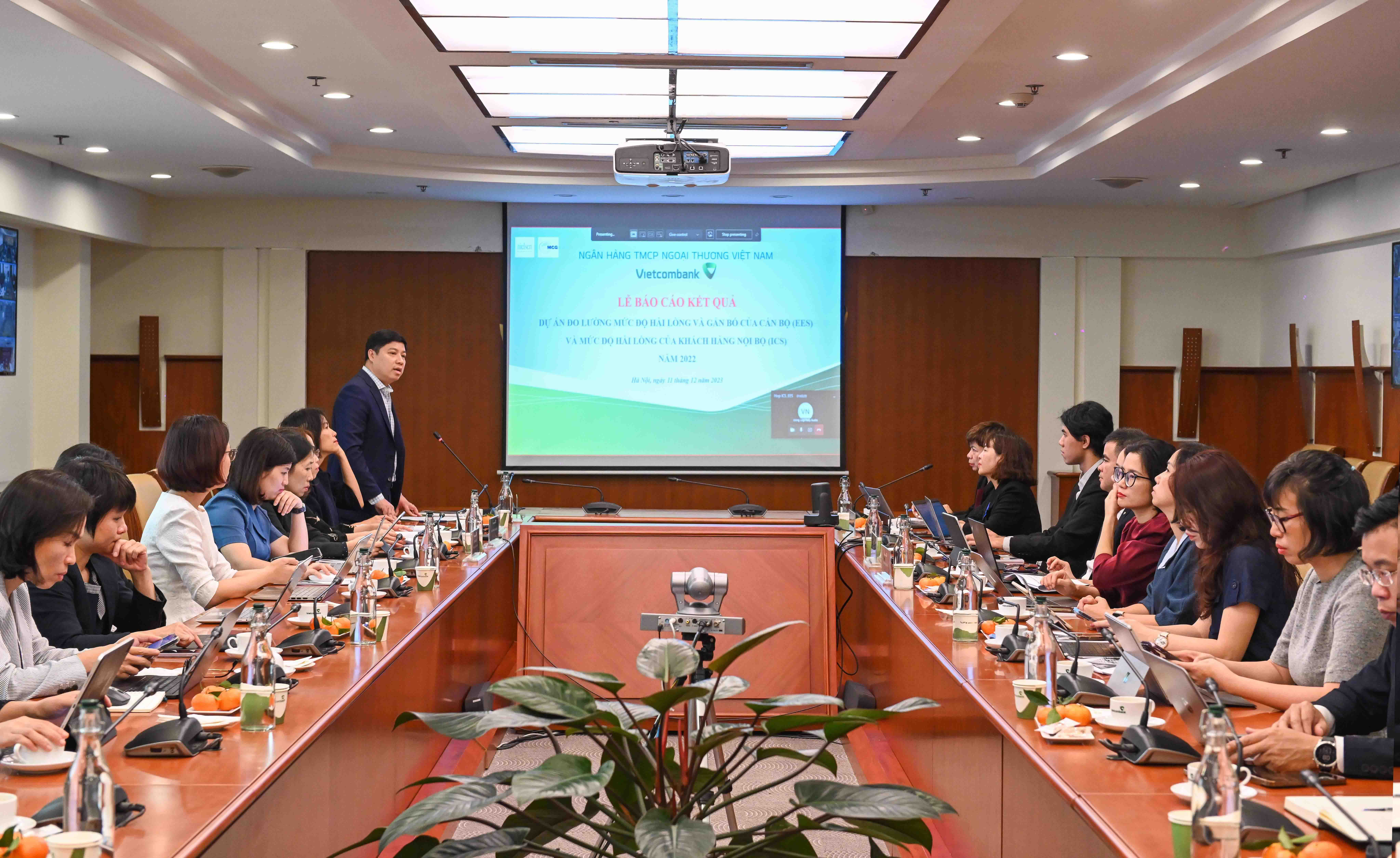 Đại diện phía đối tác, bà Đặng Thúy Hà - Giám đốc Công ty TNHH NielsenIQ Việt Nam báo cáo kết quả dự án khảo sát, đo lường EES ICS năm 2022 và kế hoạch triển khai dự án năm 2023. Đồng thời, đại diện Liên danh Nielsen - MCG cũng cam kết sẽ thực hiện dự án với tinh thần trách nhiệm cao nhất, đảm bảo chất lượng và tiến độ, hoàn thành các mục tiêu đề ra, đáp ứng kỳ vọng của Ban lãnh đạo Vietcombank.