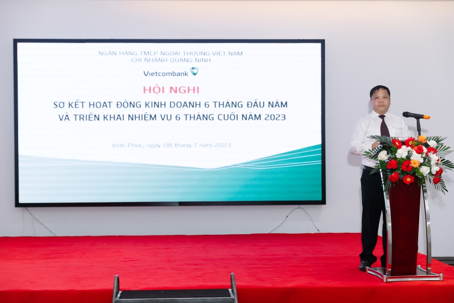 Ông Hoàng Quốc Chiến - Bí thư Đảng ủy, Giám đốc Vietcombank Quảng Ninh báo cáo kết quả hoạt động kinh doanh 6 tháng đầu năm và triển khai nhiệm vụ 6 tháng cuối năm 2023