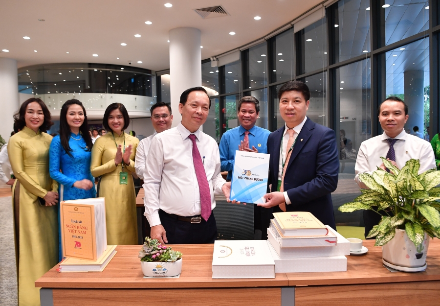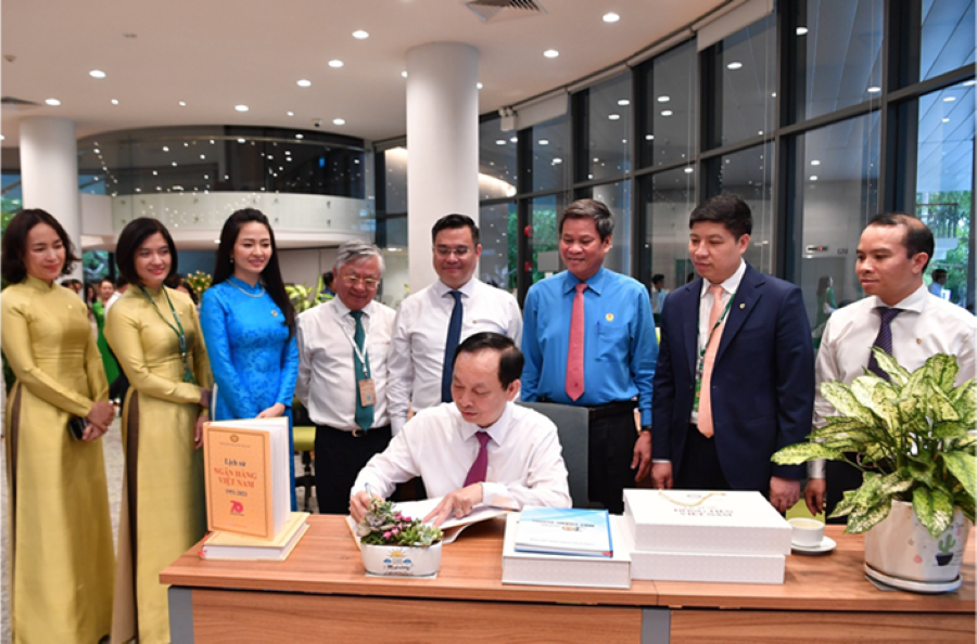 Đ/c Đào Minh Tú - Phó Bí thư Ban cán sự Đảng, Phó Thống đốc Thường trực Ngân hàng nhà nước Việt Nam, Chủ tịch Công đoàn Ngân hàng Việt Nam ký và trao tặng sách cho đ/c Hồng Quang - UV BTV Công đoàn Ngân hàng Việt Nam, Thành viên HĐQT kiêm Giám đốc Khối Nhân sự, đại diện Công đoàn Vietcombank