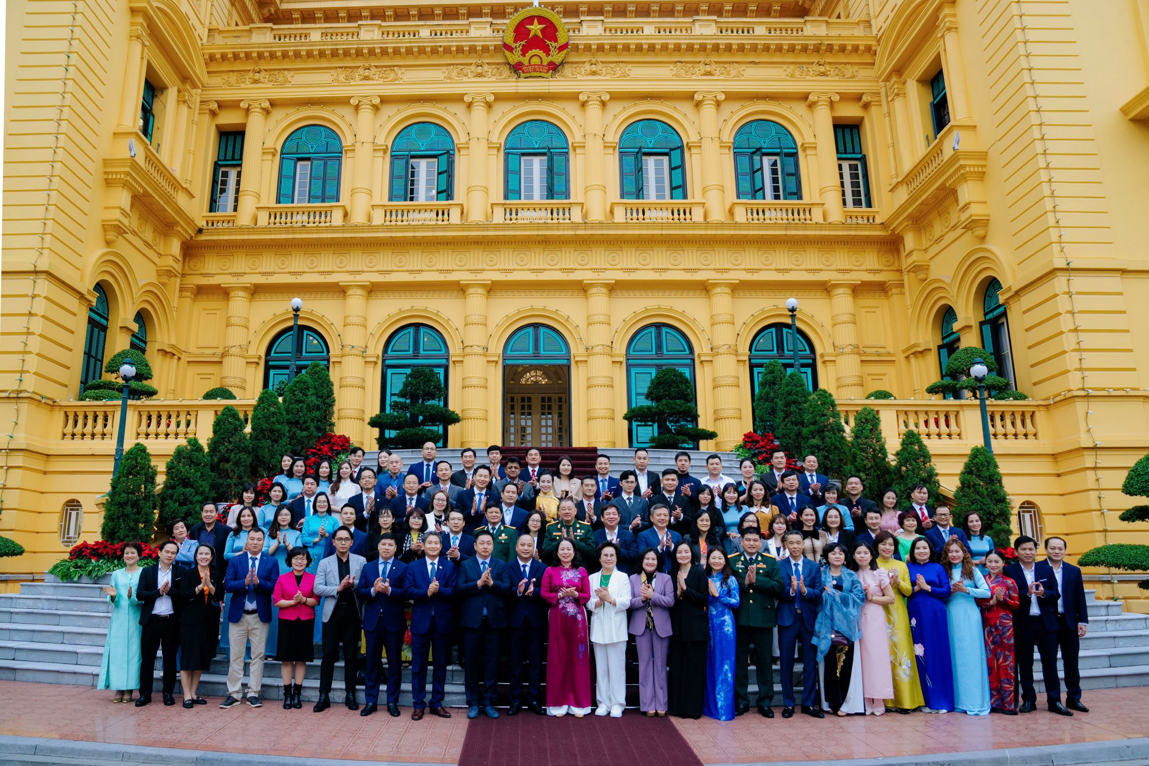 Phó Chủ tịch nước Võ Thị Ánh Xuân chụp ảnh lưu niệm với các nhà tài trợ tiêu biểu đã có những đóng góp tích cực cho các hoạt động vì trẻ em. Đ/c Hồng Quang - thành viên HĐQT, Chủ tịch Công đoàn Vietcombank, Thành viên Hội đồng bảo trợ Quỹ bảo trợ trẻ em Việt Nam (đứng thứ 7, hàng đầu từ trái sang).