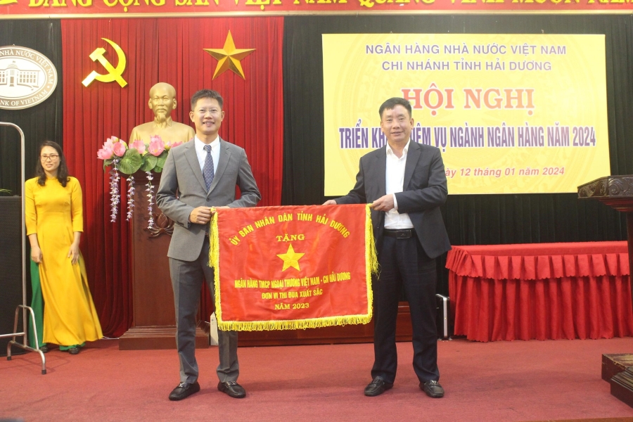 Đại diện Vietcombank Hải Dương, ông Nguyễn Xuân Cao Cường - Giám đốc Chi nhánh nhận cờ thi đua xuất sắc từ lãnh đạo tỉnh Hải Dương