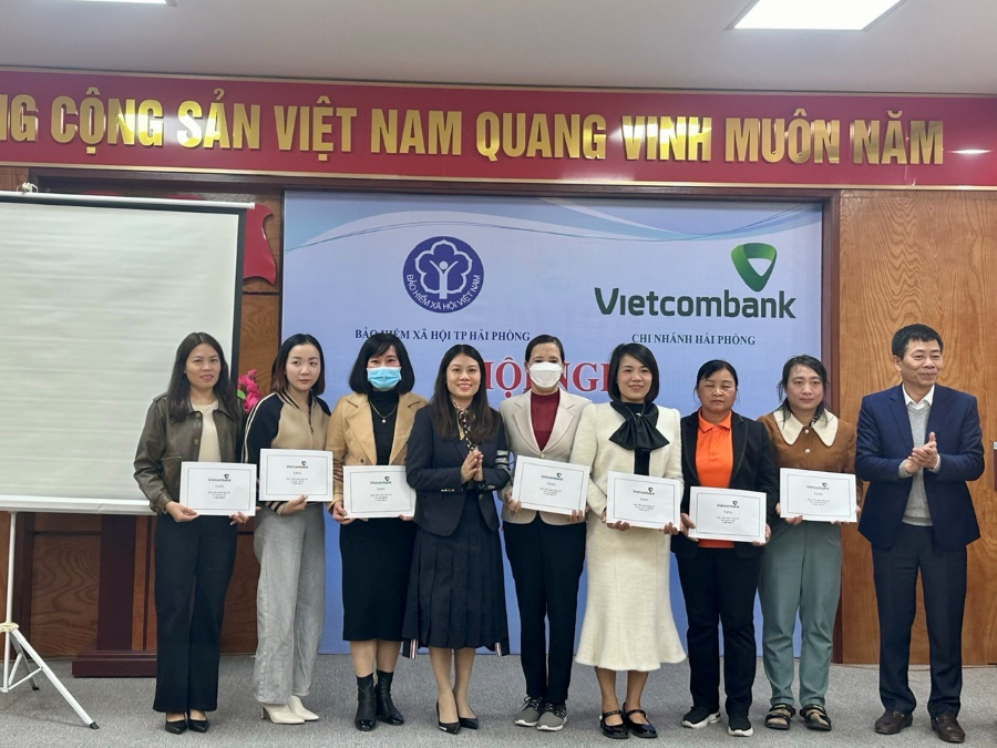 Ngày 26 và 27/12/2023, Vietcombank Hải Phòng phối hợp với Bảo hiểm xã hội thành phố Hải Phòng tổ chức lễ trao tặng sổ BHXH, thẻ BHYT cho 10 đơn vị BHXH trên địa bàn thành phố với tổng số tiền tài trợ là 280 triệu đồng.