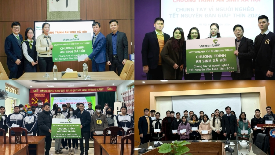 Đại diện Vietcombank Hà Thành trao quà tặng Tết cho các em học sinh, sinh viên có hoàn cảnh khó khăn tại các trường Đại học Nguyễn Trãi, Đại học Hữu Nghị, THPT Phạm Ngũ Lão, Học viện Quản lý giáo dục.