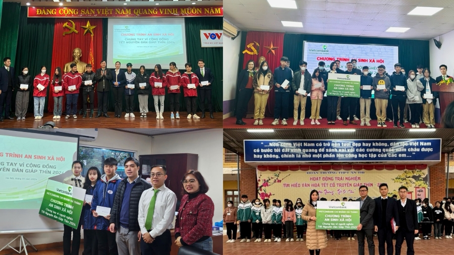 Đại diện Vietcombank Hà Thành trao quà tặng Tết cho các em học sinh, sinh viên có hoàn cảnh khó khăn tại các trường Cao đẳng VOV, THPT Mai Hắc Đế, THPT Hà Thành, THPT Ân Thi.