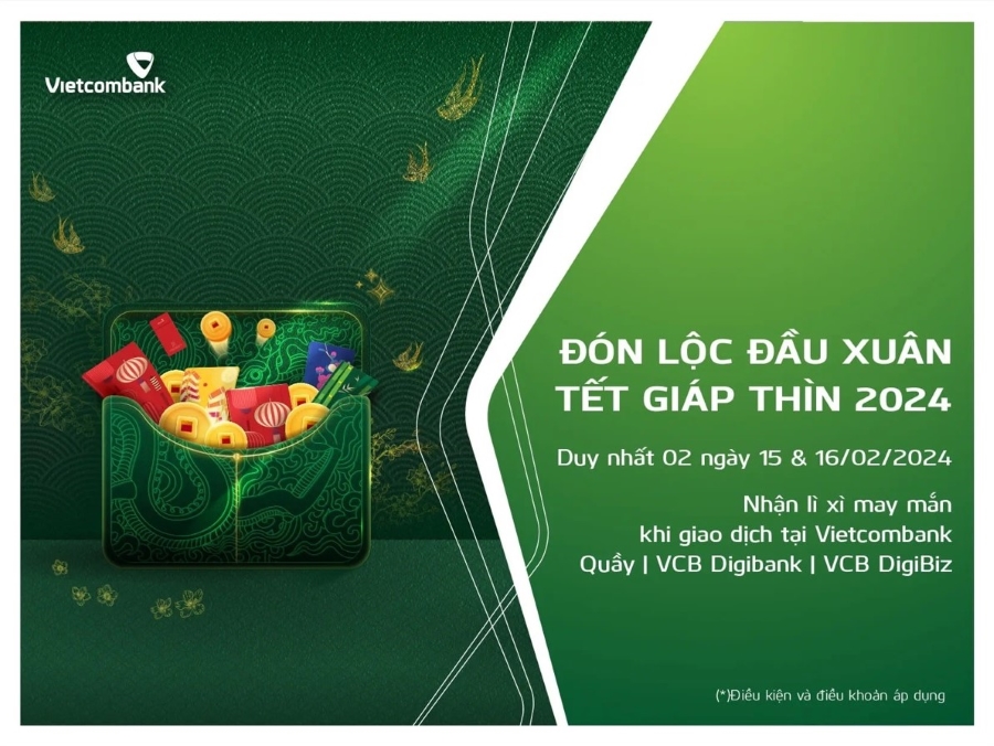Trong 02 ngày làm việc đầu tiên của năm Giáp Thìn (15/02-16/02/2024), khách hàng giao dịch tại quầy và giao dịch online thỏa mãn các điều kiện của chương trình sẽ được nhận món quà “lì xì” may mắn đầu năm trị giá 100.000 VND từ Vietcombank.