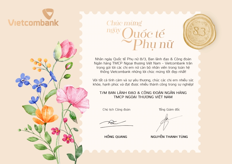 Nhân ngày Quốc tế Phụ nữ 8/3, Ban lãnh đạo và Công đoàn Ngân hàng TMCP Ngoại thương Việt Nam gửi Thiệp chúc mừng tới nữ cán bộ nhân viên trong hệ thống Vietcombank.