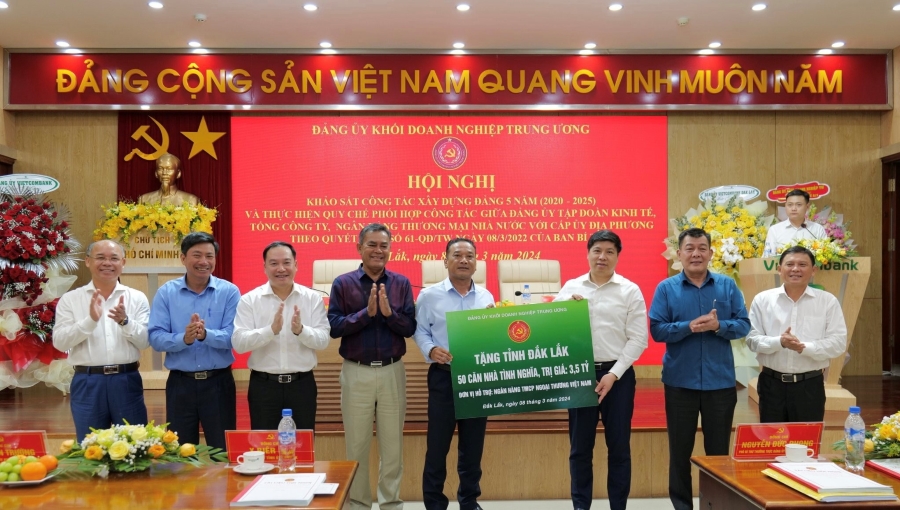 Đặc biệt, nhân dịp này, Đảng ủy Khối Doanh nghiệp Trung ương đã tặng tỉnh Đắk Lắk 50 căn nhà tình nghĩa với tổng giá trị 3,5 tỷ đồng. Toàn bộ kinh phí do Ngân hàng TMCP Ngoại thương Việt Nam (Vietcombank) tài trợ. Có thể nói đây là hoạt động thường xuyên của Vietcombank trên địa bàn, đồng hành cùng các cấp ủy địa phương trong công tác an sinh xã hội, góp phần xây dựng tỉnh Đắk Lắk ngày càng văn minh giàu đẹp.