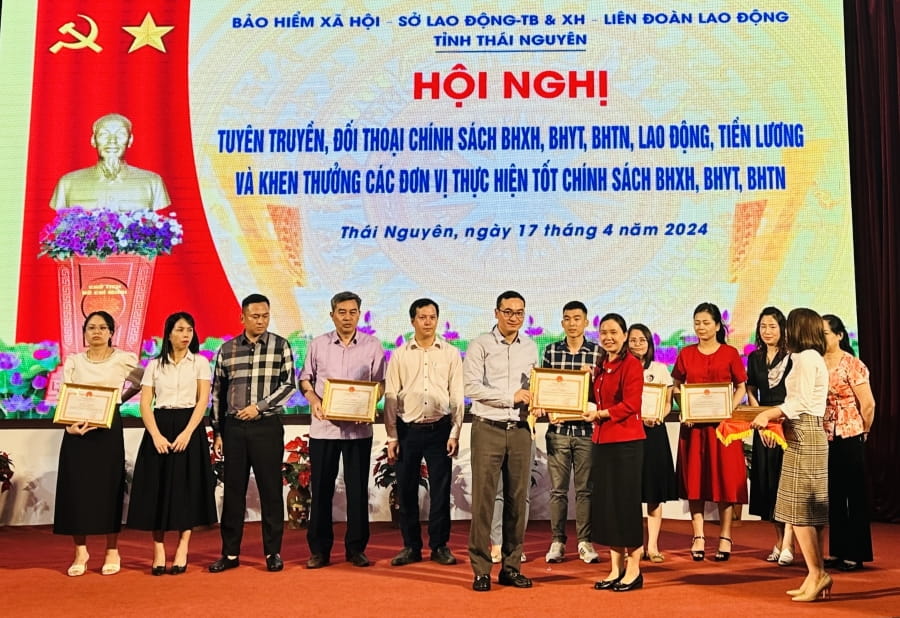 Sáng 17/4/2024, Bảo hiểm xã hội tỉnh Thái Nguyên phối hợp với các ngành, đơn vị tổ chức hội nghị tuyên truyền, đối thoại chính sách bảo hiểm xã hội (BHXH), bảo hiểm y tế (BHYT), bảo hiểm thất nghiệp (BHTN), lao động, tiền lương và tổ chức khen thưởng các đơn vị thực hiện tốt chính sách BHXH, BHYT, BHTN với các doanh nghiệp trên địa bàn tỉnh.
