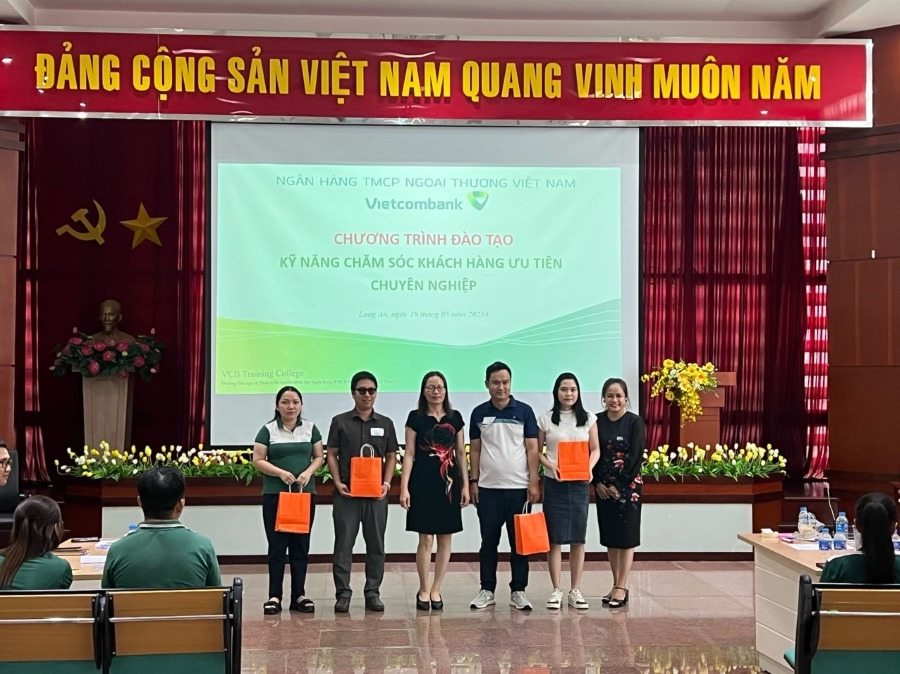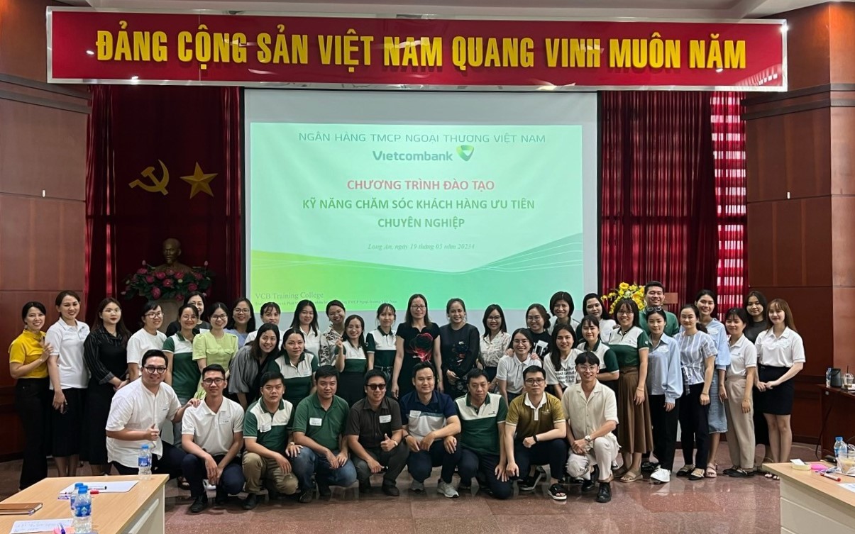 Ngày 19/5/2024, Trường Đào tạo và Phát triển nguồn nhân lực phối hợp cùng Vietcombank Long An đã tổ chức thành công chương trình đào tạo “Kỹ năng chăm sóc khách hàng ưu tiên chuyên nghiệp" tại chi nhánh.