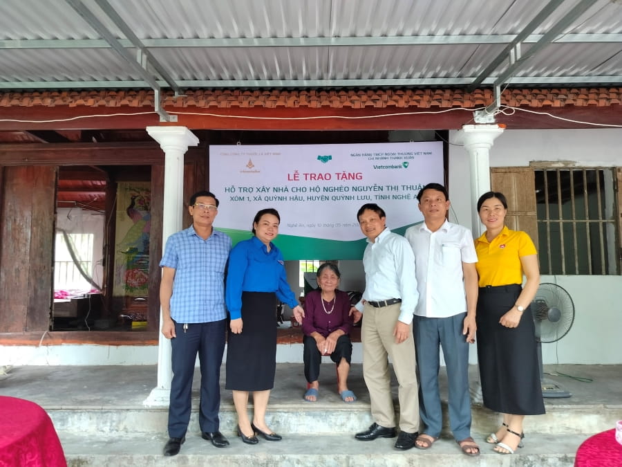 Ông Nguyễn Đình Viễn - Phó Giám đốc Vietcombank Thanh Xuân, Phó Chủ tịch Công đoàn cơ sở (Thứ 3 từ phải sang) cùng đại diện Đoàn Thanh Niên của Vietcombank Thanh Xuân, đại diện Đoàn Thanh Niên của Tổng công ty Thuốc lá Việt Nam trao nhà tình nghĩa trị giá 50 triệu đồng cho hộ nghèo tại xã Quỳnh Hậu, huyện Quỳnh Lưu, tỉnh Nghệ An