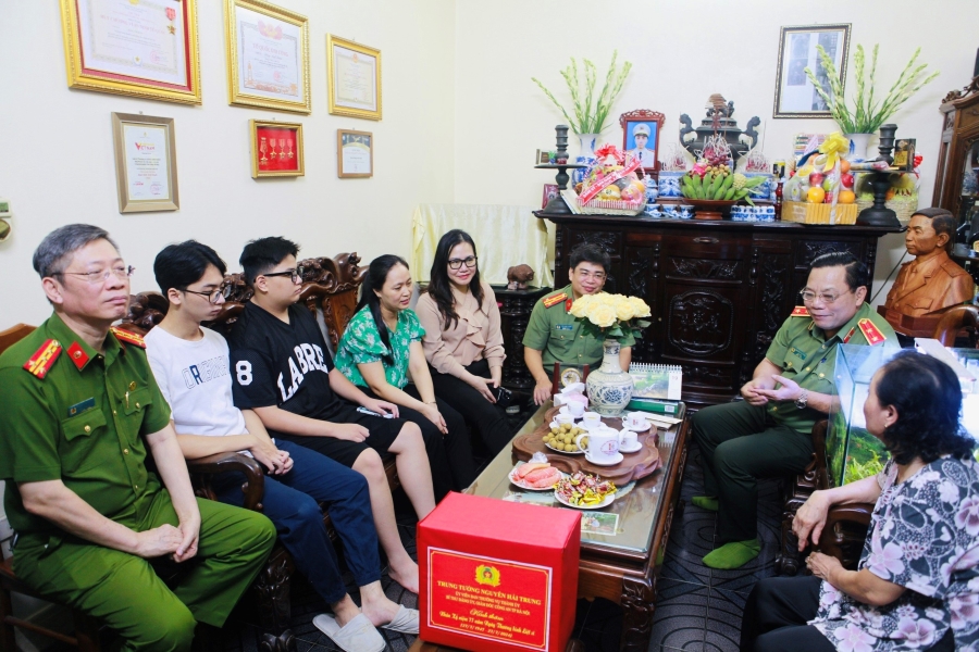 Trung tướng Nguyễn Hải Trung - Ủy viên BTV Thành ủy, Bí thư Đảng ủy, Giám đốc Công an TP. Hà Nội cùng đoàn công tác thắp hương, trò chuyện cùng thân nhân Liệt sĩ Đặng Anh Quân