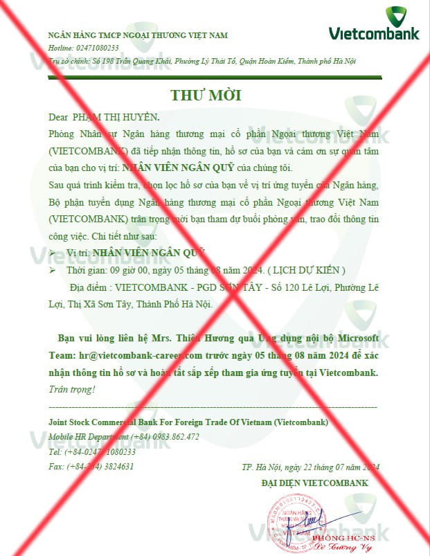 - Mạo danh Vietcombank gửi email thông báo tuyển dụng và mời phỏng vấn và yêu cầu ứng viên chuyển khoản một khoản tiền phí hoặc yêu cầu ứng viên tham gia vòng sơ tuyển online bằng cách tải ứng dụng/nhấn vào đường link,…