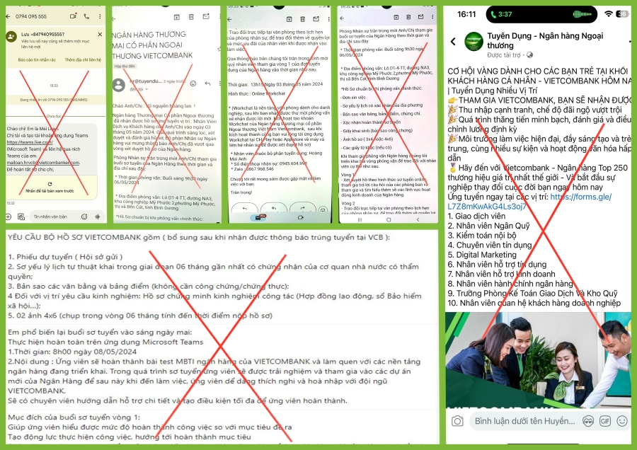 - Lập nick giả mạo chuyên viên tuyển dụng Vietcombank và đề nghị ứng viên vào group zalo, telegram, sau đó dẫn dắt, hướng dẫn tải app/nhấn vào đường link/bình chọn ảnh/trải nghiệm và đánh giá sản phẩm/tham gia dự án/thực hiện nhiệm vụ/…