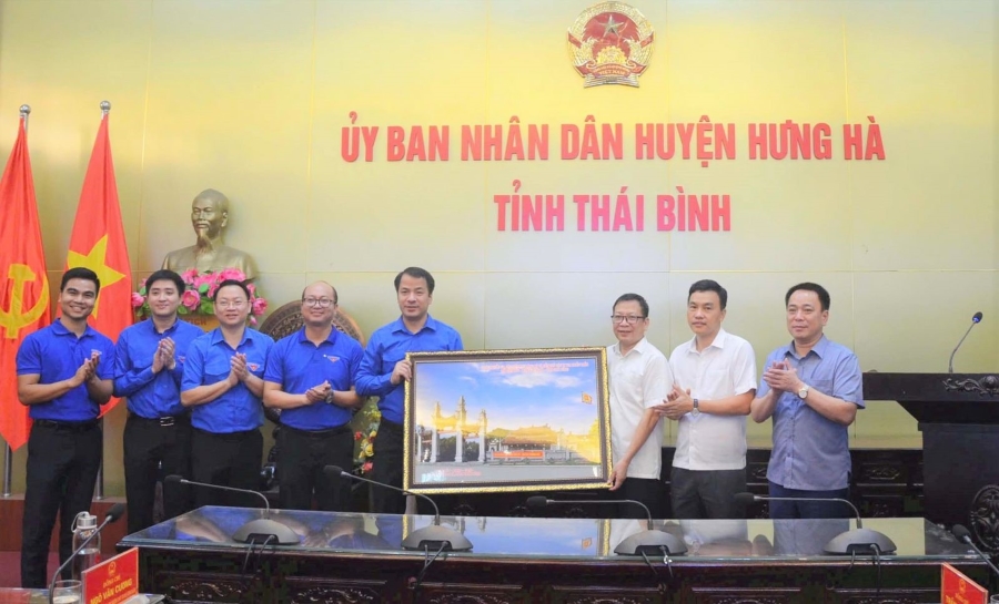Các đồng chí lãnh đạo huyện Hưng Hà tặng quà lưu niệm cho Trung ương Đoàn TNCS Hồ Chí Minh và Vietcombank