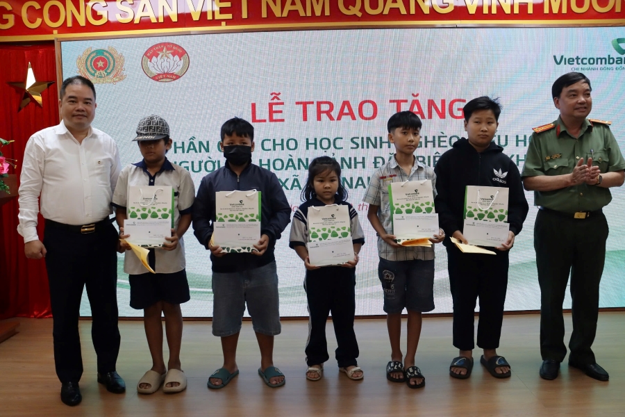 Đồng chí Trần Thành Nam - Bí thư Chi bộ, Giám đốc Chi nhánh (ngoài cùng bên trái) và Thượng tá Lê Đình Minh - Phó trưởng phòng An ninh kinh tế Công an tỉnh Đồng Nai (ngoài cùng bên phải) trao quà cho các trẻ em nghèo có hoàn cảnh khó khăn trên địa bàn xã Hố Nai 3, huyện Trảng Bom tỉnh, Đồng Nai