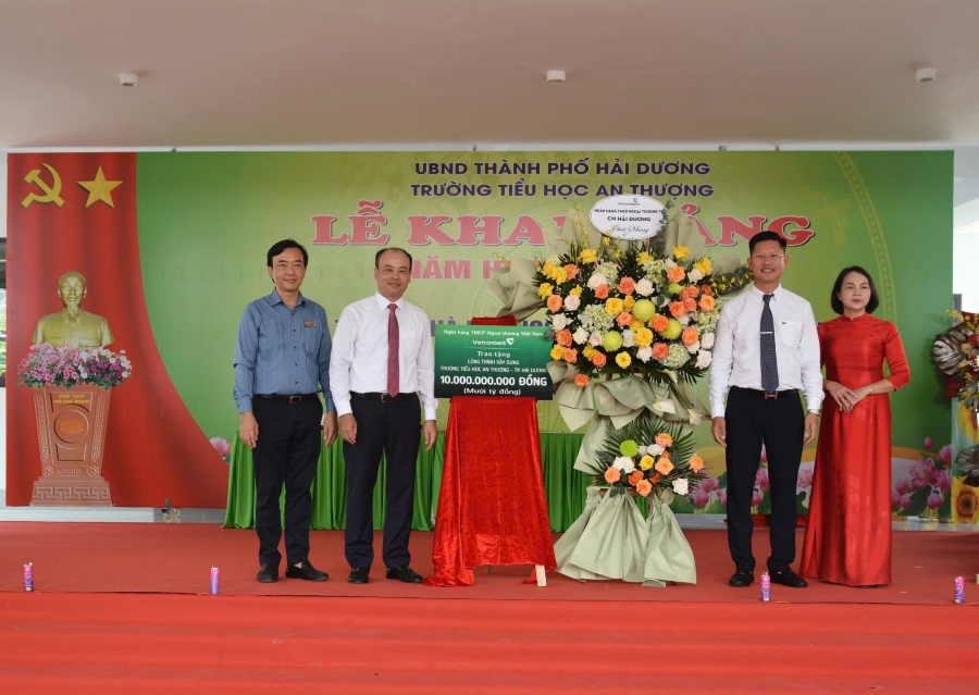 Tham dự buổi lễ có ông Trần Hồ Đăng - Phó Bí thư thành ủy, Chủ tịch UBND thành phố Hải Dương; ông Nguyễn Xuân Cao Cường - Giám đốc Vietcombank Hải Dương; đại diện lãnh đạo xã An Thượng, đại diện nhà thầu thi công cùng các thầy cô giáo và các em học sinh trường tiểu học An Thượng.