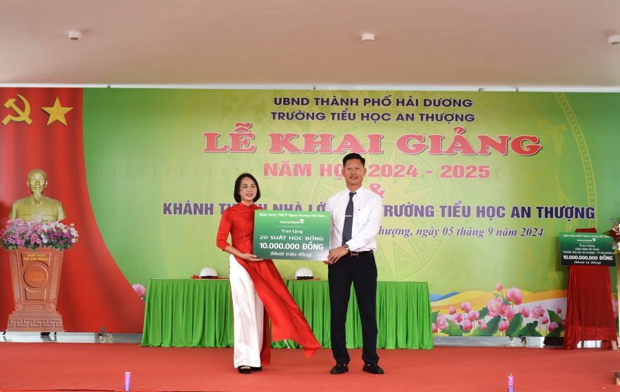Cũng trong buổi sáng ngày 05/9/2024, Vietcombank Hải Dương đã dành tặng 80 suất học bổng cho các em học sinh có hoàn cảnh khó khăn tại các trường học trên địa bàn thành phố Hải Dương và các huyện lân cận với tổng số tiền trao tặng là 40 triệu đồng, trong đó: Trường Tiểu học An Thượng (20 suất), Trường THCS Võ Thị Sáu (40 suất), Trường Tiểu học Dân Chủ (10 suất), Trường THCS Dân Chủ, huyện Tứ Kỳ (10 suất), mỗi suất học bổng trị giá 500 nghìn đồng. Đây là hoạt động thường niên, góp phần chia sẻ khó khăn và tiếp thêm động lực cho các em học sinh vươn lên trong học tập.