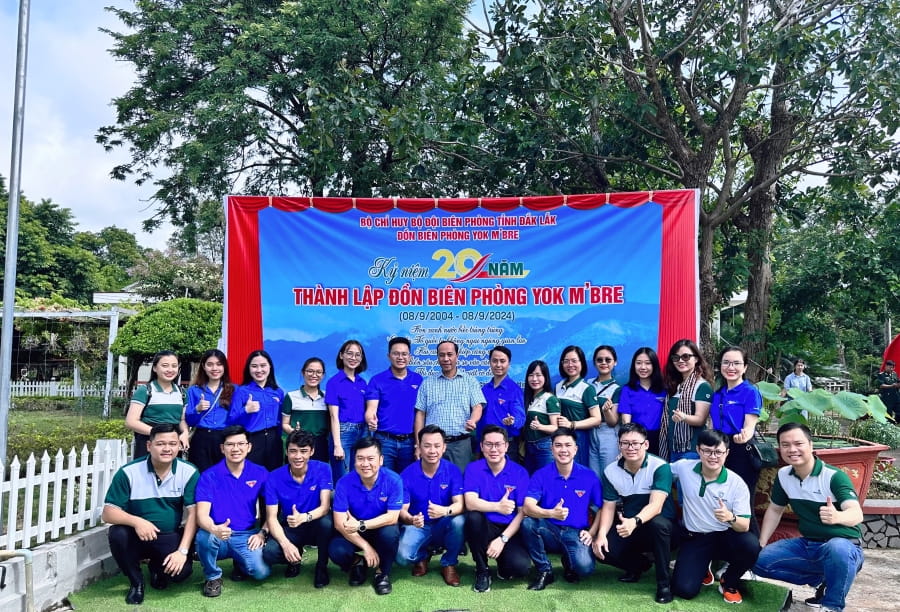 Đồng chí Hoàng Xuân Thành - Phó Bí thư Đảng uỷ, Phó Giám đốc Vietcombank Đắk Lắk (đứng giữa) cùng đại diện các Đoàn viên thanh niên khu vực Nam Trung Bộ và Tây Nguyên chụp hình kỷ niệm cùng Lễ kỷ niệm 20 năm ngày thành lập đồn biên phòng Yok M’rê (08/9/2004 - 08/9/2024)