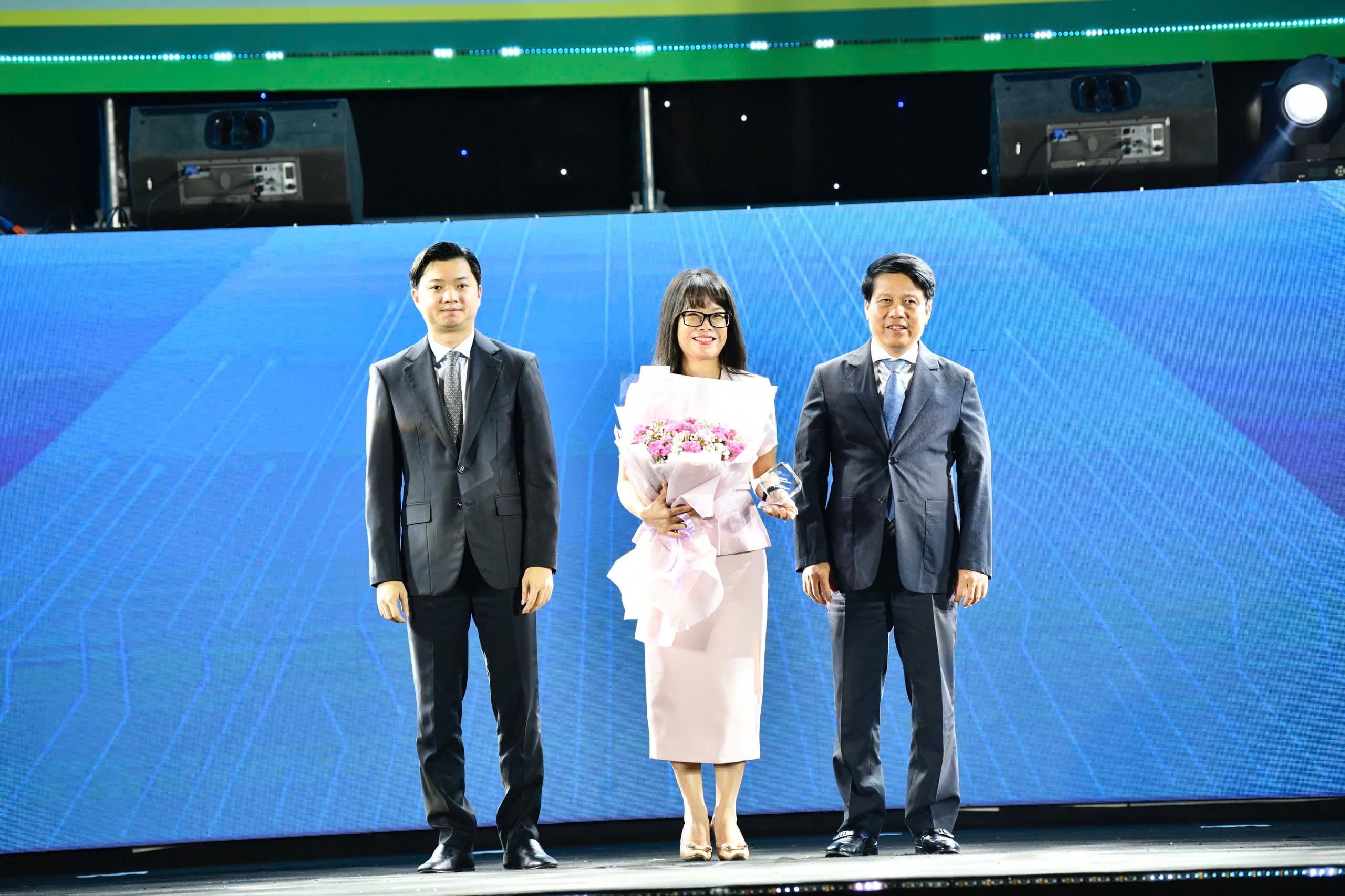 Ông Phạm Tiến Dũng - Phó Thống đốc Ngân hàng Nhà nước Việt Nam (bên phải) và ông Nguyễn Minh Triết - Chủ tịch T.Ư Hội Sinh viên Việt Nam (bên trái) trao tặng hoa và kỷ niệm chương của Ngày thẻ Việt Nam 2024 tới Nhà tài trợ Kim cương là Vietcombank với đại diện là bà Đoàn Hồng Nhung - Giám đốc Khối Bán lẻ Vietcombank (đứng giữa)