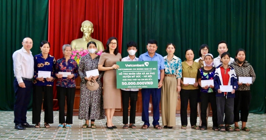 Chiều ngày 04/10/2024, bà Hoàng Thị Khánh - Phó Bí thư chi bộ, Chủ tịch Công đoàn cơ sở, Phó Giám đốc Vietcombank Nam Hà Nội đại diện Chi nhánh đã trao tặng phần quà 50 triệu đồng hỗ trợ nhân dân xã An Phú, huyện Mỹ Đức, Hà Nội.