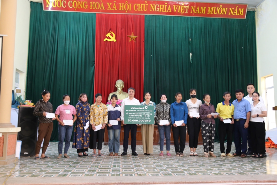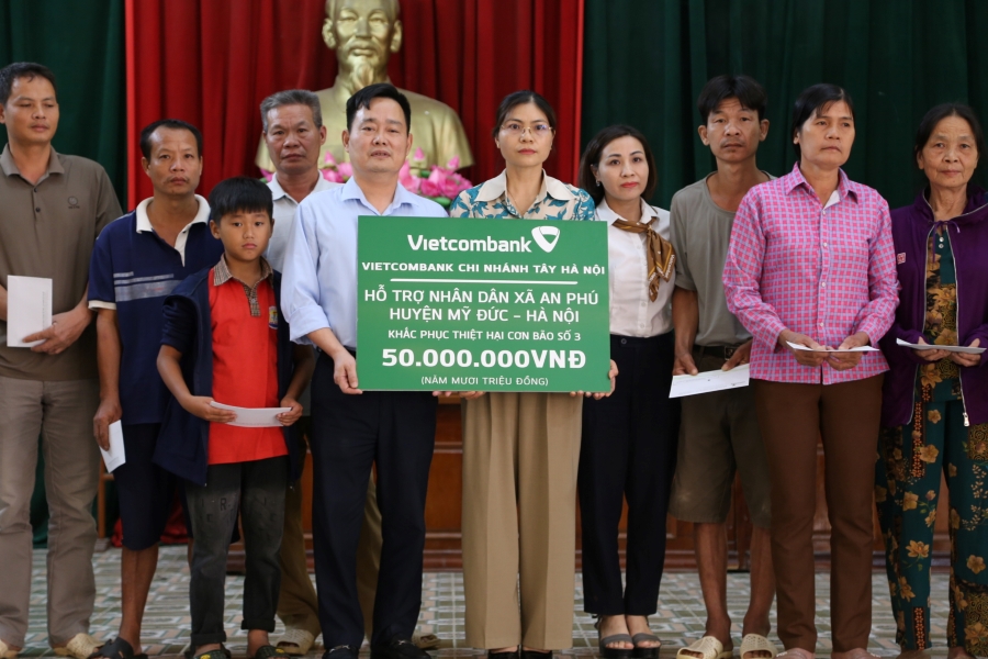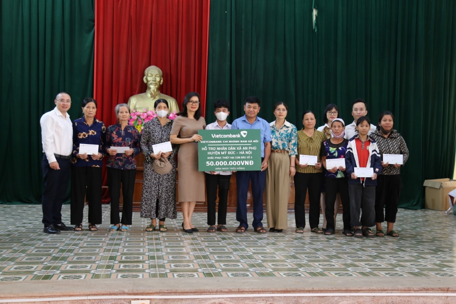 Ngày 04/10/2024, Vietcombank Hà Thành, Nam Hà Nội,Tây Hà Nội đã phối hợp thực hiện chương trình an sinh xã hội, hỗ trợ xã An Phú, huyện Mỹ Đức, Hà Nội khắc phục thiệt hại cơn bão số 3. Theo đó, ba chi nhánh đã hỗ trợ 150 triệu đồng với tổng số 300 suất quà.