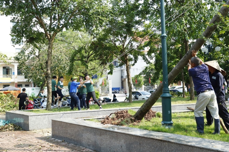 Đoàn thanh niên Vietcombank Chương Dương hỗ trợ dựng lại cây xanh bị đổ do hậu quả của cơn bão số 3