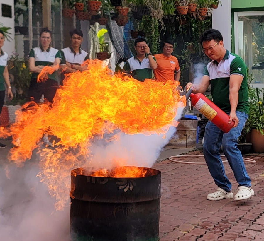 Phần thực hành, đại diện Phòng cảnh sát PCCC& CNCH đã hướng dẫn phân biệt các loại bình chữa cháy, khi nào sử dụng loại bình bột, khi nào sử dụng bình khí CO2, thao tác sử dụng bình chữa cháy xách tay khi phát sinh cháy. Sau đó, từng CBNV đã tự thực hành thao tác dùng bình chữa cháy dập tắt đám cháy.