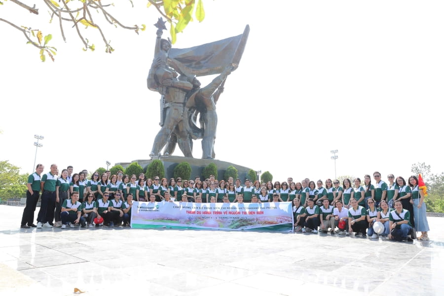 Đoàn Vietcombank Hải Phòng chụp ảnh lưu niệm tại Tượng đài Chiến thắng Điện Biên Phủ.