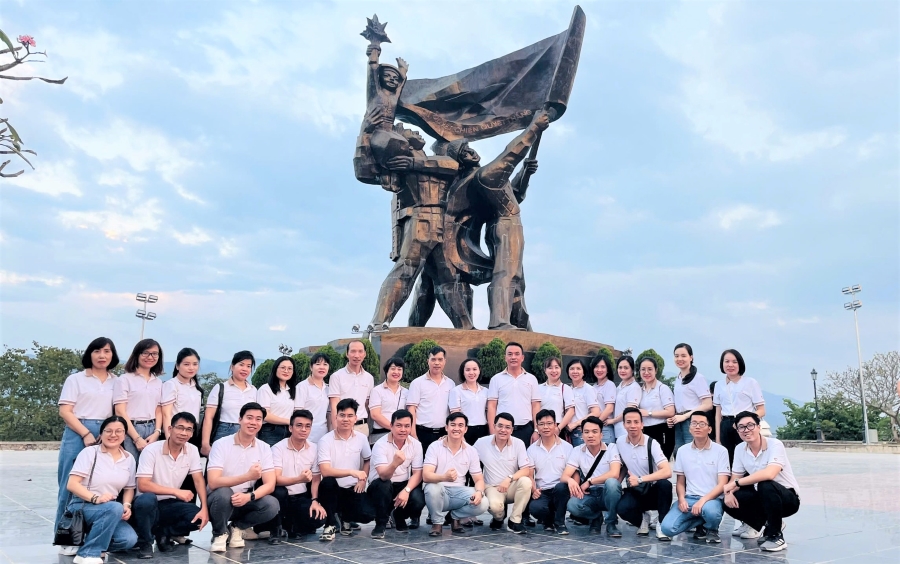 Chi bộ Vietcombank Nam Hải Phòng chụp ảnh lưu niệm tại công trình Đền thờ liệt sĩ chiến trường Điện Biên Phủ