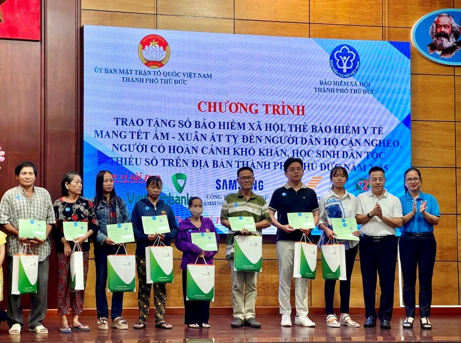 Ngày 19/01/2025, Vietcombank Thủ Thiêm phối hợp cùng Bảo hiểm xã hội TP.Thủ Đức trao tặng 100 triệu đồng kinh phí mua sổ BHXH, thẻ BHYT và nhiều phần quà Tết cho người dân hộ cận nghèo, người có hoàn cảnh khó khăn, học sinh dân tộc thiểu số trên địa bàn TP.Thủ Đức.