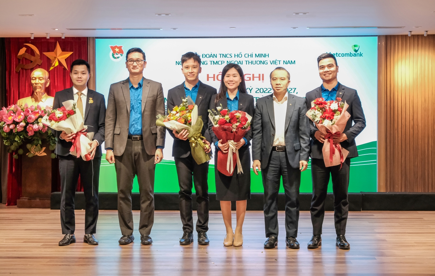 Đ/c Đỗ Khắc Dũng - Phó Bí thư Đoàn Thanh niên Khối DNTW (thứ 2 từ trái sang) và đ/c Đỗ Việt Hùng - Phó Bí thư Thường trực Đảng ủy, Thành viên HĐQT Vietcombank (thứ 2 từ phải sang) tặng hoa chúc mừng tân Phó Bí thư và các đồng chí tân Ủy viên Ban Chấp hành Đoàn Thanh niên Vietcombank khóa IV, nhiệm kỳ 2022 – 2027