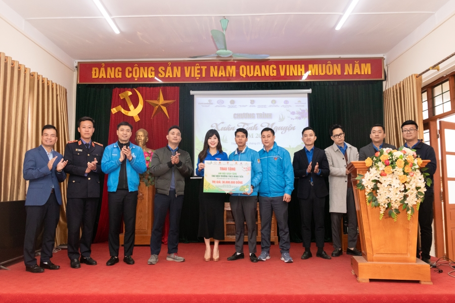 Đoàn công tác trao tặng sách cho thư viện Trường THCS Minh Tiến
