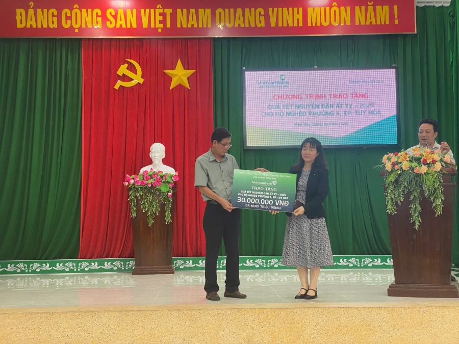 Tiếp tục chuỗi hoạt động ý nghĩa, Vietcombank Phú Yên đã tổ chức trao quà Tết cho các hộ nghèo tại phường 4, TP. Tuy Hòa vào ngày 21/01/2025. Đ/c Nguyễn Thị Kim Hoa - Phó Giám đốc, Chủ tịch CĐCS Chi nhánh đã trực tiếp đến UBND phường 4 trao tặng 60 suất quà, mỗi suất trị giá 500 nghìn đồng, tổng số tiền trao tặng là 30 triệu đồng.
