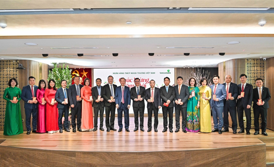 Đ/c Đào Minh Tú (thứ 10 từ trái sang) - Phó Bí thư Ban Cán sự Đảng, Phó Thống đốc Thường trực Ngân hàng Nhà nước Việt Nam trao tặng lì xì cho Ban lãnh đạo Vietcombank nhân dịp năm mới Ất Tỵ 2025