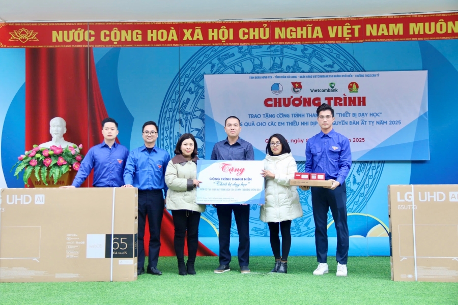 Ngày 8/2, tại trường THCS Cán Tỷ, huyện Quản Bạ, tỉnh Hà Giang, Ban giám đốc, Ban chấp hành Đoàn Thanh niên Vietcombank Phố Hiến tổ chức chương trình “Trao tặng công trình Thanh niên - Thiết bị dạy học” cho nhà trường, gồm: 02 tivi, 01 bộ máy tính xách tay, 02 máy trợ giảng không dây với tổng giá trị 50 triệu đồng.