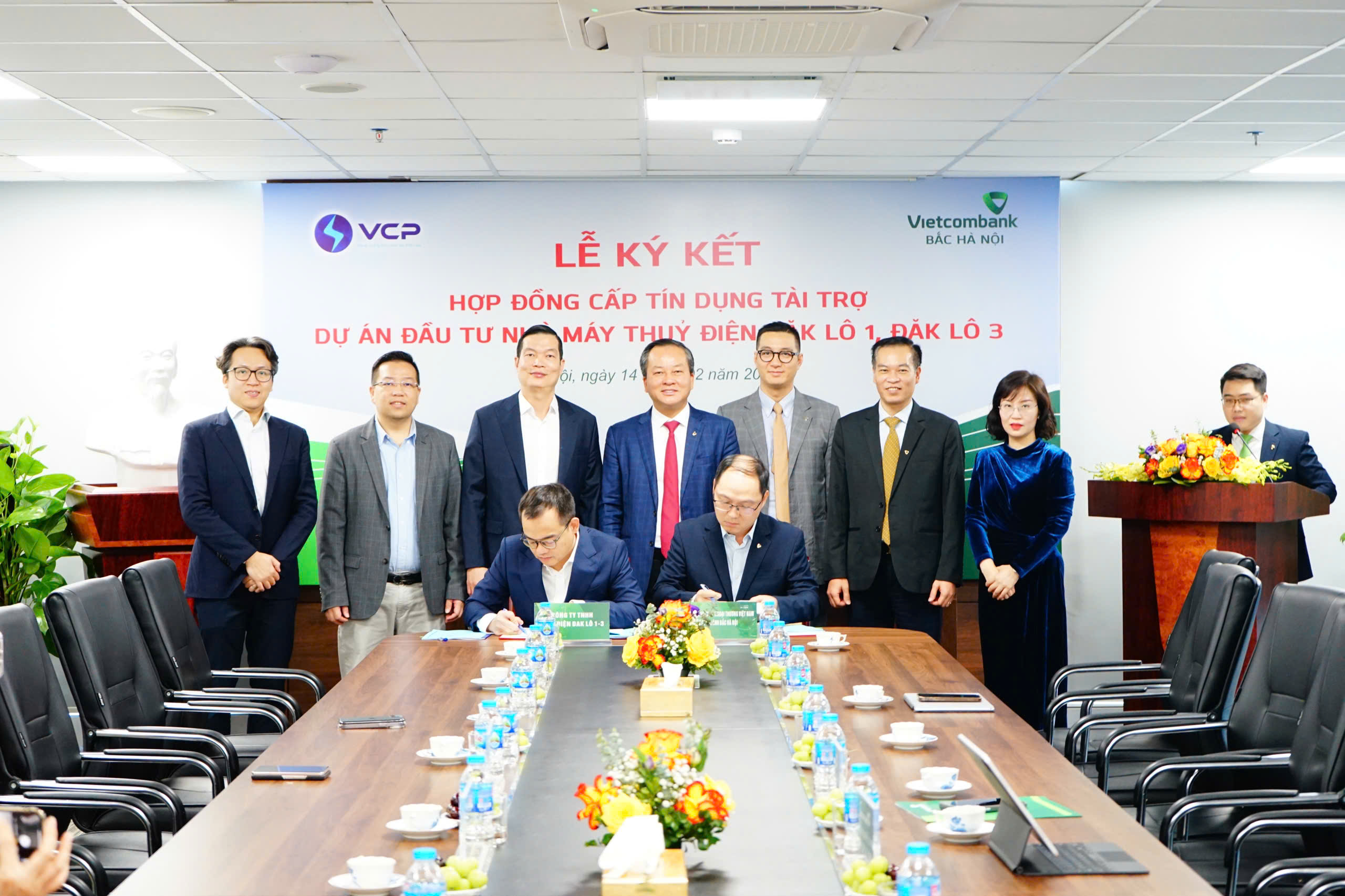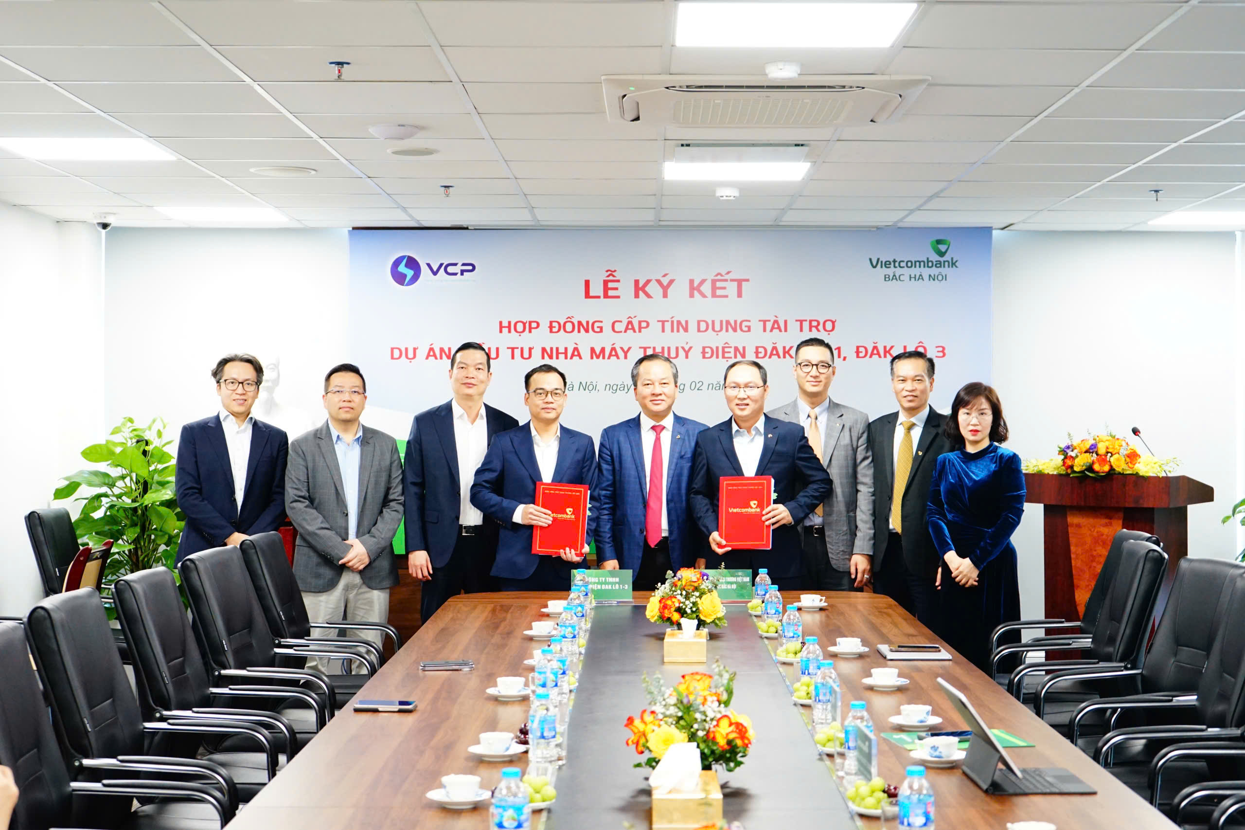 Sáng ngày 14/02/2025, tại trụ sở Vietcombank Bắc Hà Nội đã diễn ra lễ ký kết hợp đồng tín dụng tài trợ các dự án thuỷ điện Đăk Lô 1, Đăk Lô 3 với tổng giá trị cấp tín dụng 850 tỷ đồng giữa Vietcombank Bắc Hà Nội và Công ty TNHH Thuỷ điện Đak Lô 1-3, Công ty cổ phần xây dựng và năng lượng VCP.