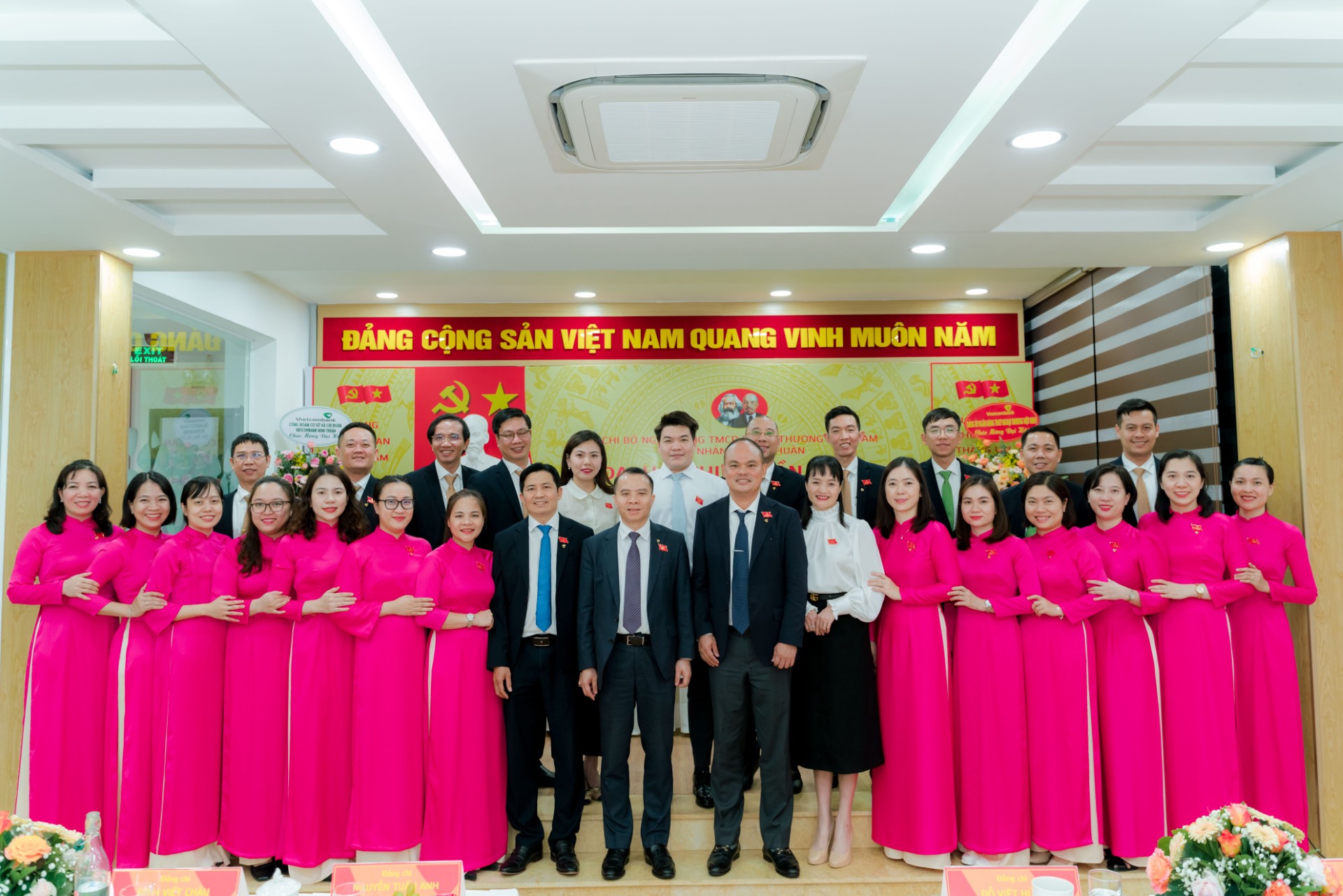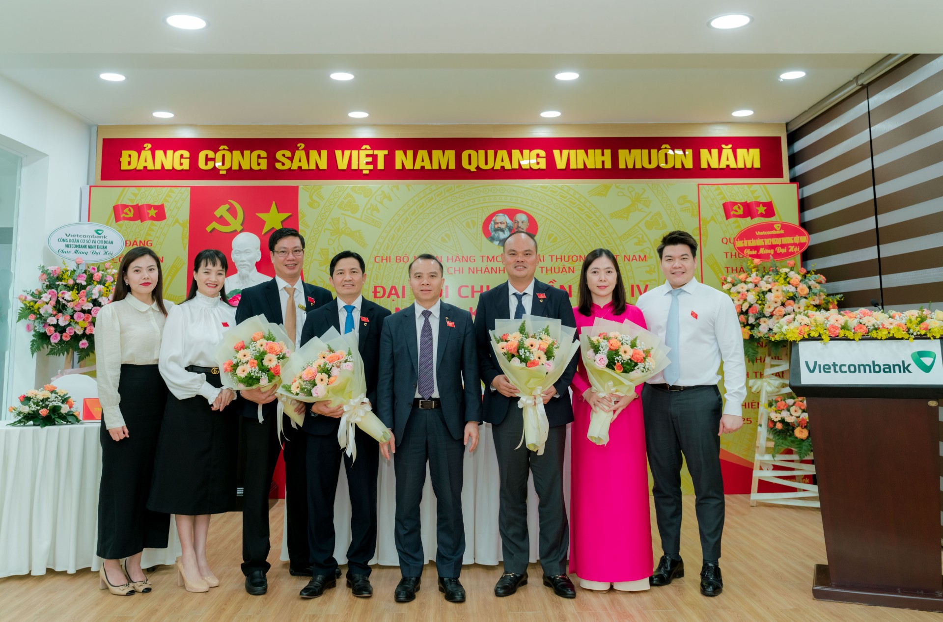 Đ/c Đỗ Việt Hùng - Phó Bí thư thường trực Đảng ủy, Thành viên HĐQT Vietcombank (đứng thứ 9 từ phải sang, hàng thứ 1), đ/c Nguyễn Tuấn Anh - Bí thư Chi bộ, Giám đốc Vietcombank Ninh Thuận (đứng thứ 8 từ phải sang, hàng thứ 1) chụp ảnh lưu niệm cùng các đại biểu
