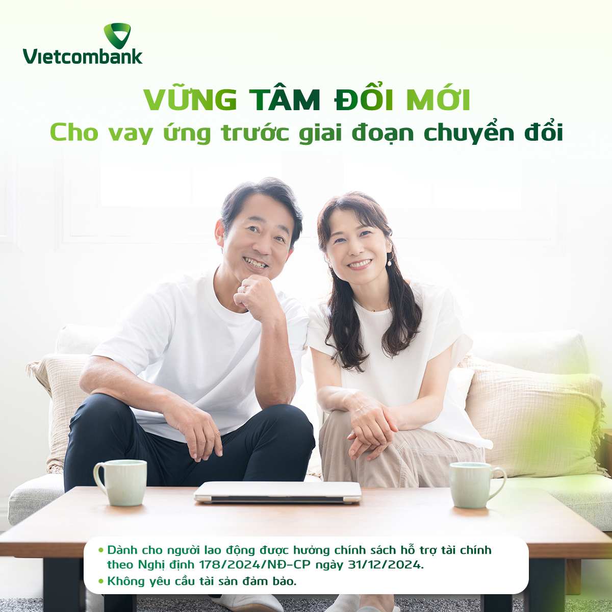 Từ ngày 16/4/2025, Vietcombank triển khai cho vay ứng trước giai đoạn chuyển đổi dành cho người lao động theo quy định tại Nghị định 178/2024/NĐ-CP ngày 31/12/2024 của Chính phủ. Sản phẩm mang đến giải pháp tài chính thiết thực, đồng hành cùng khách hàng vững tâm bước vào giai đoạn mới và tiếp tục phát triển.