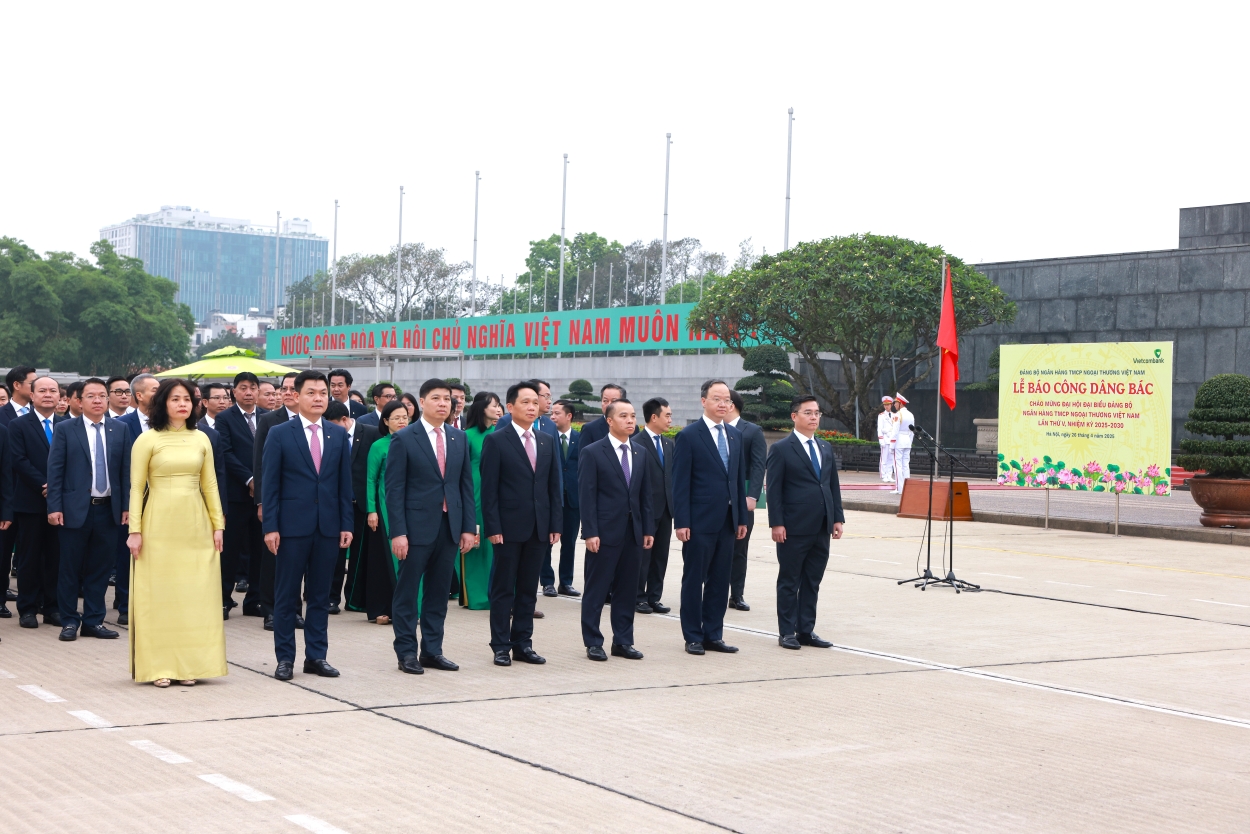 Trong chuỗi các sự kiện chào mừng Đại hội đại biểu Đảng bộ Ngân hàng TMCP Ngoại thương Việt Nam (Vietcombank) lần thứ V, nhiệm kỳ 2025-2030, ngày 26/4/2025, tại Quảng trường Ba Đình lịch sử, toàn thể các đồng chí trong Đảng ủy, Ban lãnh đạo, các đồng chí Trưởng các Phòng/Ban/Trung tâm tại Trụ sở chính cùng các đồng chí Giám đốc các Chi nhánh, các công ty con trong hệ thống Vietcombank đã vinh dự tổ chức Lễ báo công dâng Bác.