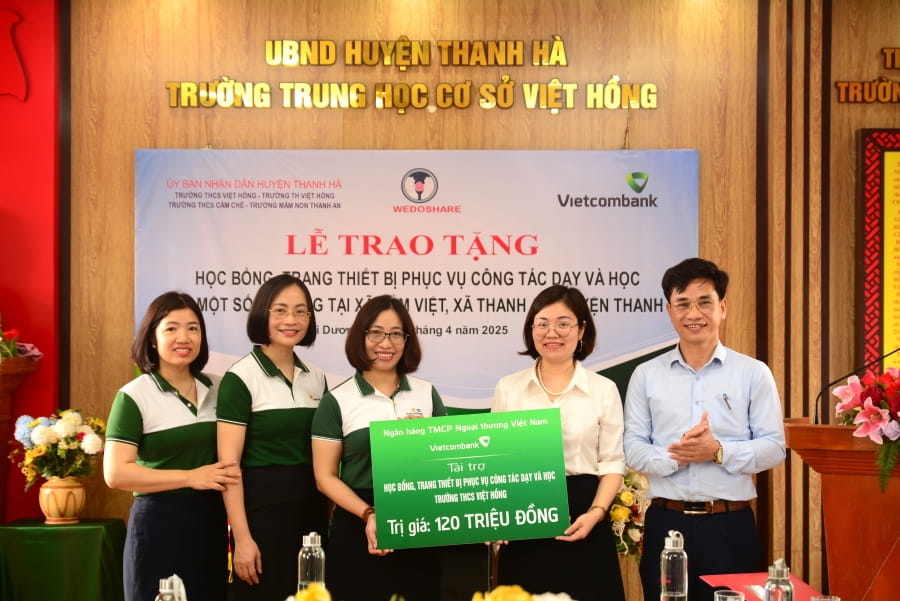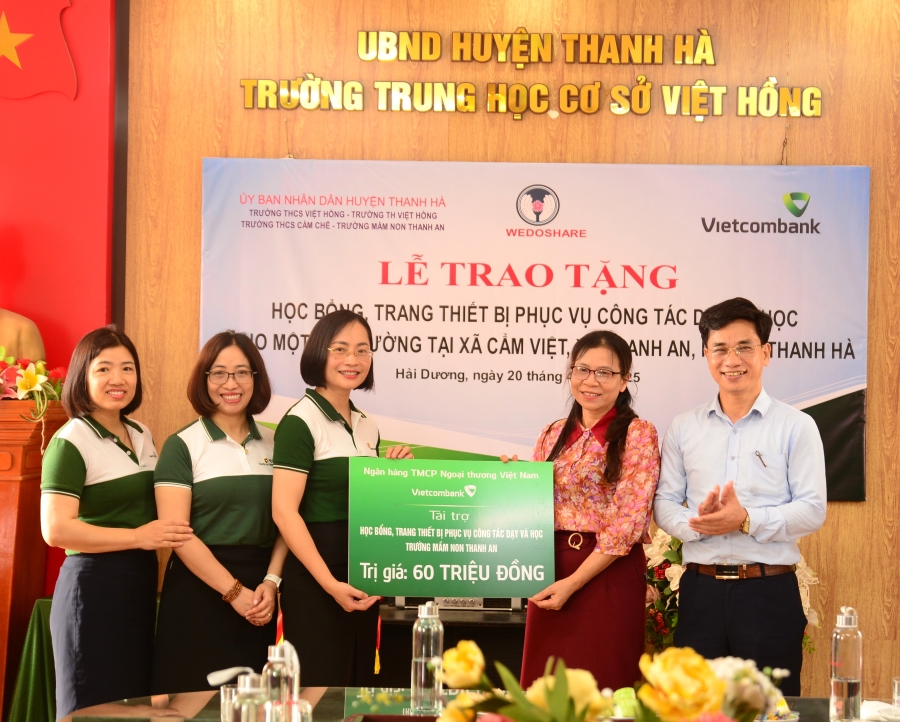 Với mong muốn nâng cao chất lượng giáo dục trên địa bàn huyện Thanh Hà, sáng ngày 20/4/2025, Vietcombank Hải Dương đã phối hợp cùng phòng/ban Trụ sở chính và lãnh đạo địa phương trao tặng học bổng và trang thiết bị phục vụ công tác giảng dạy và học tập cho 4 trường học thuộc xã Cẩm Việt, xã Thanh An, huyện Thanh Hà: Trường THCS Việt Hồng, Trường THCS Cẩm Chế, Trường Tiểu học Việt Hồng và Trường Mầm non Thanh An, với tổng số tiền trao tặng là 300 triệu đồng.