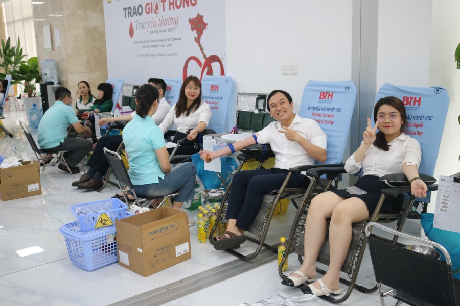 Đồng chí Nguyễn Như Tưởng - Giám đốc Chi nhánh, Bí thư Đảng bộ Vietcombank Nam Sài Gòn và đ/c Nguyễn Thị Tố Hương - Phó Giám đốc Chi nhánh, Phó Bí thư Đảng bộ, Chủ tịch CĐCS Vietcombank Nam Sài Gòn tham gia chương trình hiến máu tình nguyện năm 2025
