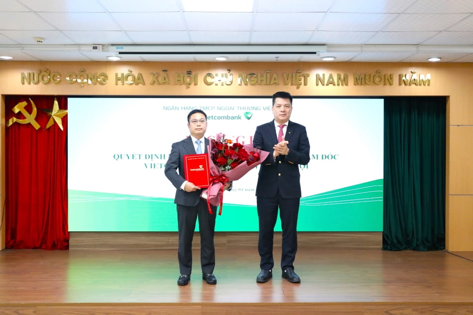 Ông Hồ Văn Tuấn - Phó Tổng Giám đốc Vietcombank trao quyết định cho ông Phan Lê Nghĩa - tân Phó Giám đốc Vietcombank Tây Hà Nội